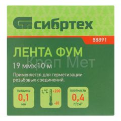 Фумлента Сибртех 88891 размером 19 мм х 10 м используется при проведении сантехнических работ для герметизации разъемных соединений. Используется при монтаже пластиковых, металлических и металлопластиковых труб для воды.
