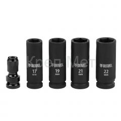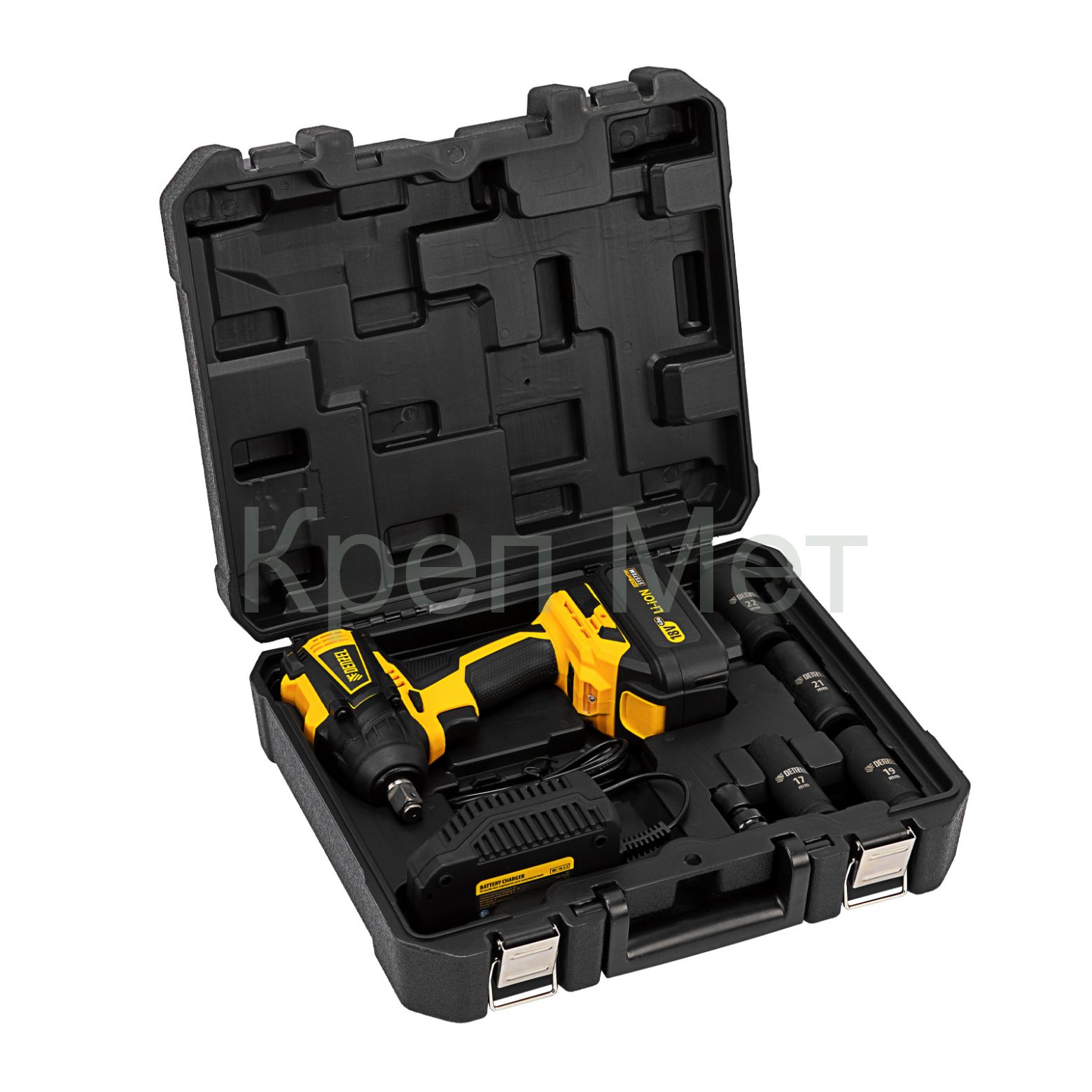 - Полная готовность к работе — в комплект входит зарядное устройство, аккумулятор, адаптер HEX 1/4 дюйма и 4 ударные торцевые головки размером 17, 19, 21 и 22 мм.
