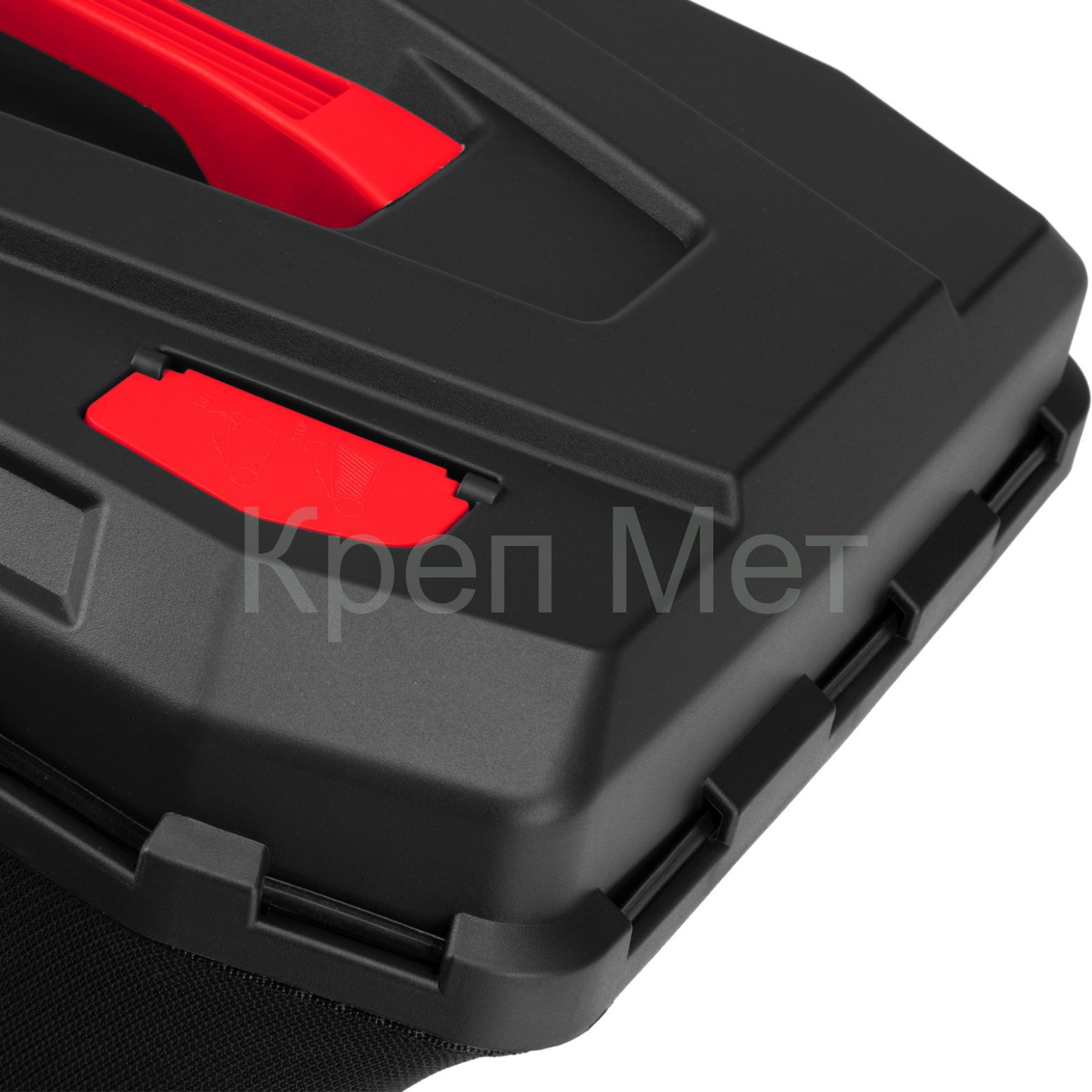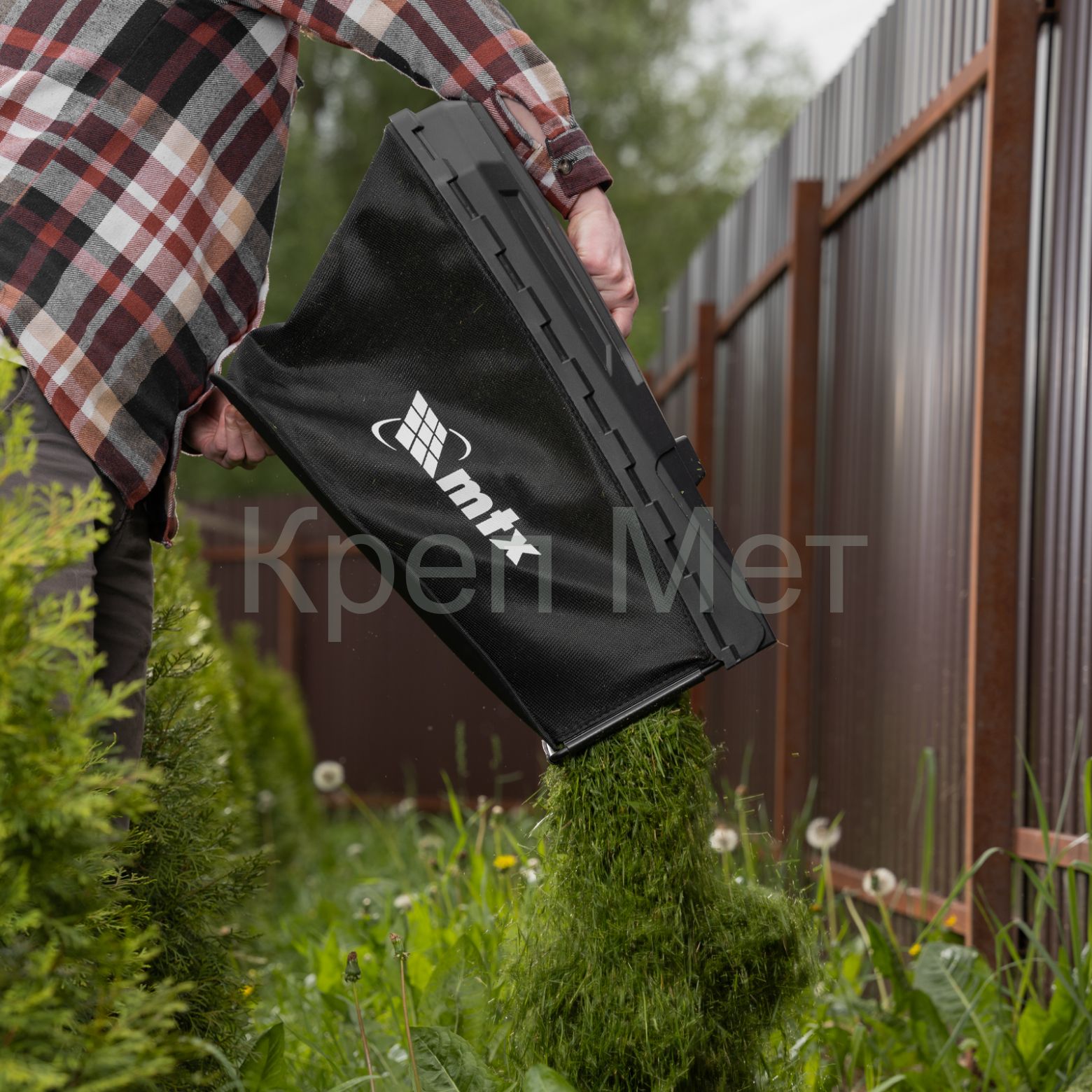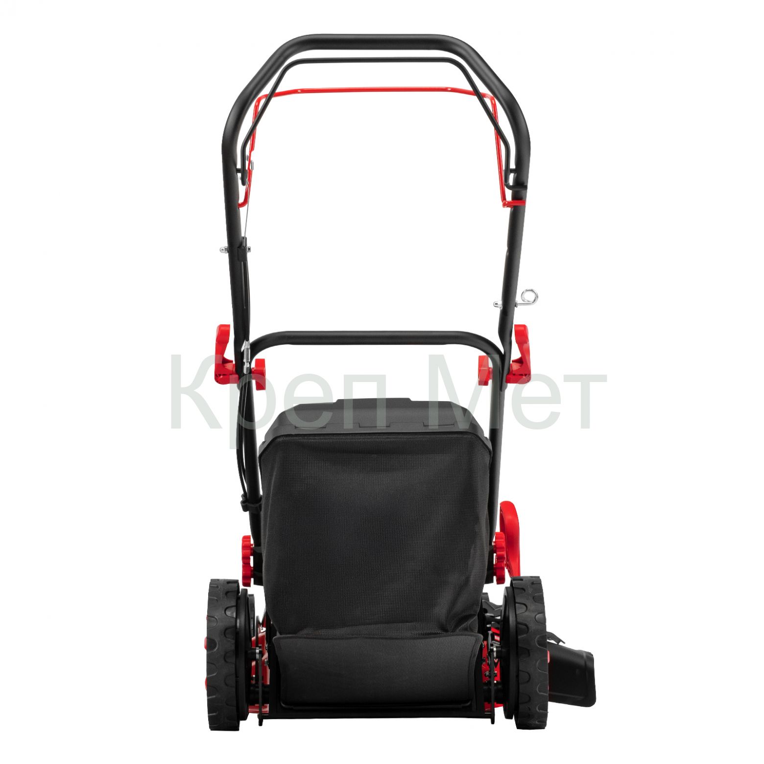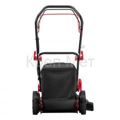 - Удобная эксплуатация и хранение — усиленная конструкция рукоятки позволяет комфортно управлять газонокосилкой, тканевый травосборник не утяжеляет конструкцию, а в сложенном состоянии не занимает много места.