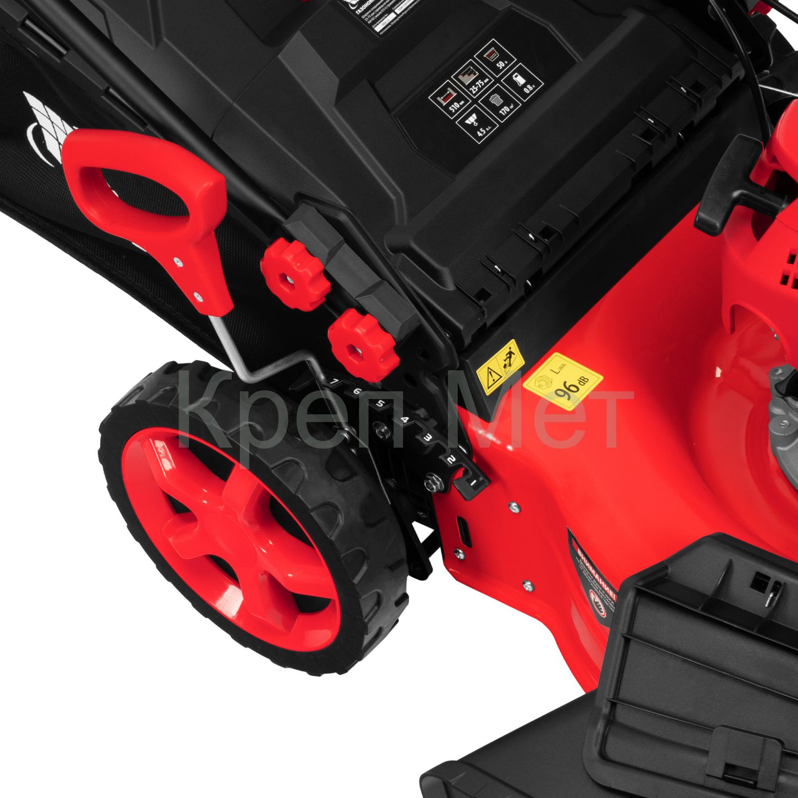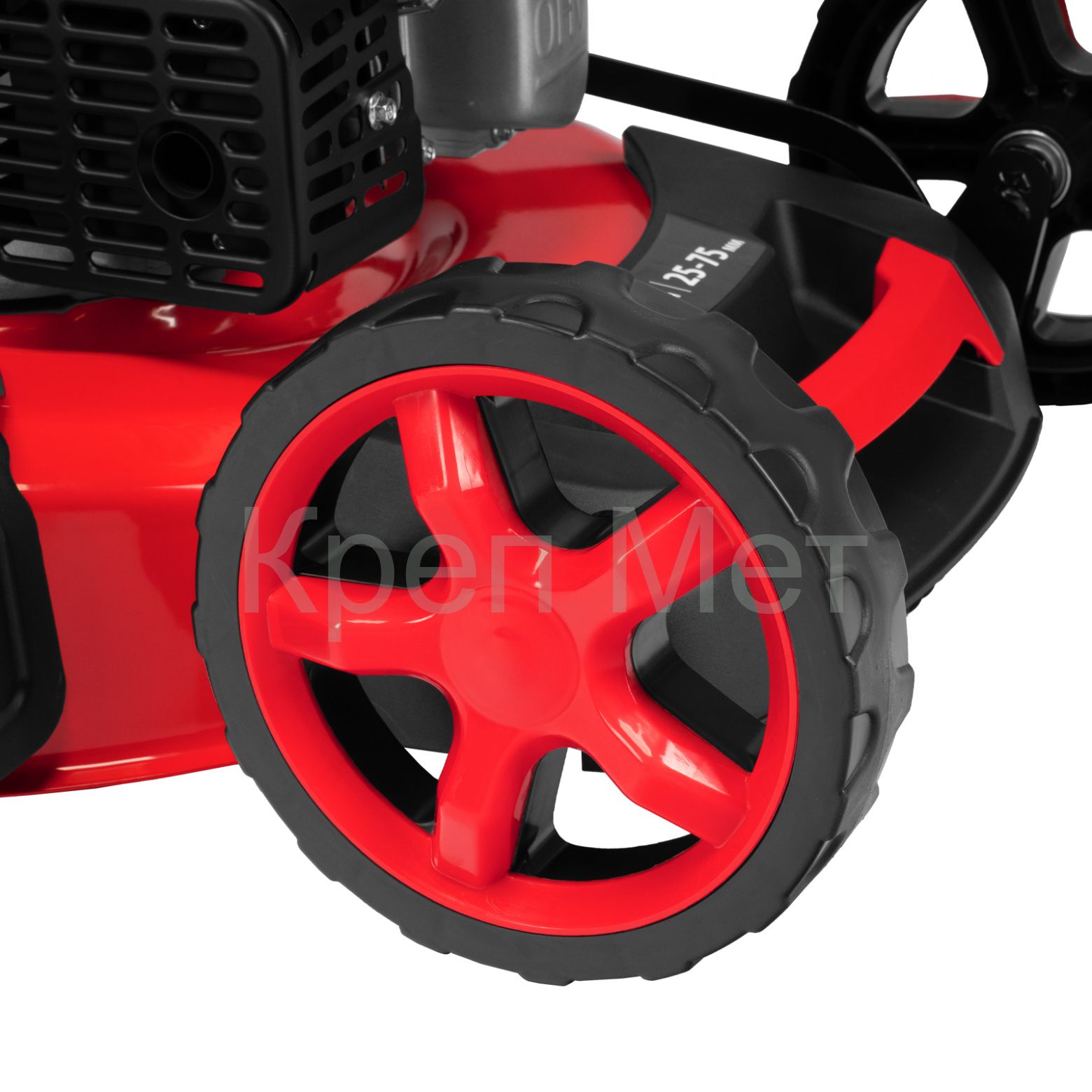 - Простая регулировка высоты скашивания — достаточно изменить положение рычага, переставлять колеса не требуется.