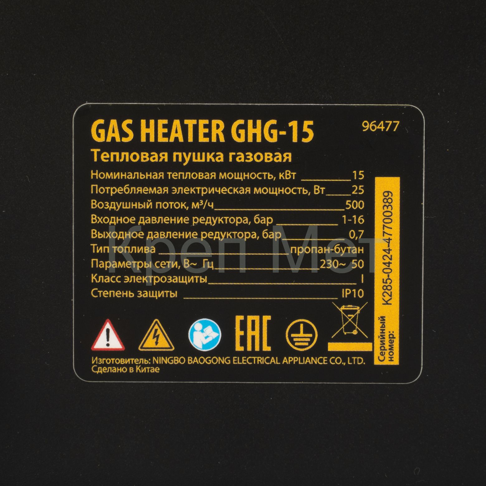 Газовая тепловая пушка GHG-15, 15 кВт, 500 м3/ч, пропан-бутан Denzel