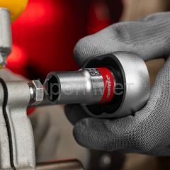 - Быстрый поиск насадки среди других инструментов — торцевая головка маркирована красной полосой, на корпус нанесено обозначение типоразмера.