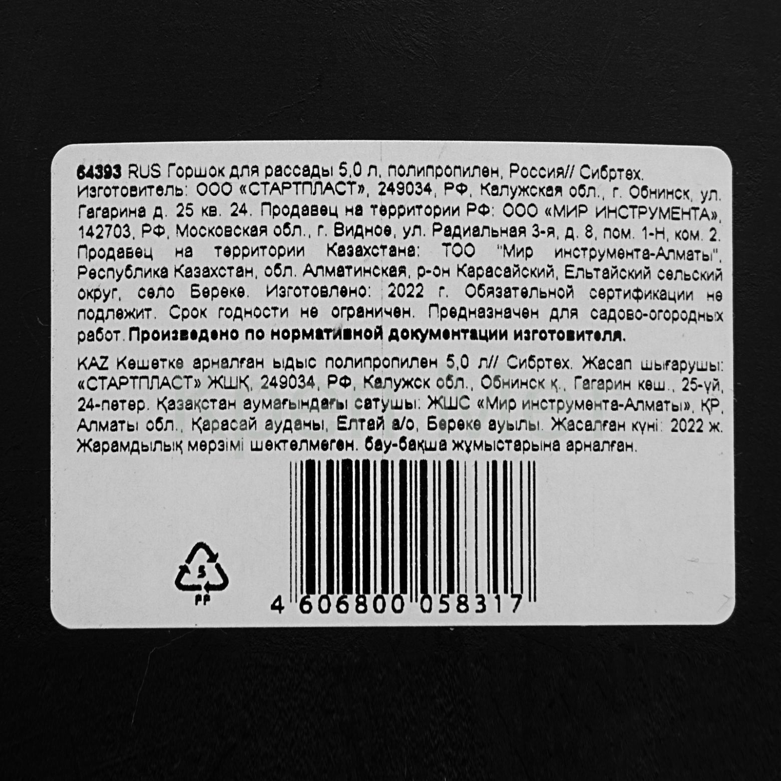 - Горшок для рассады, 5 л, полипропиленовый, Сибртех