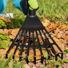 Веерные 9-зубые грабли Palisad NYLON 62395 размером 175 х 350 мм, пластиковые, используются для выполнения мелких садово-огородных работ. Благодаря 9 упругим зубьям с плоским профилем они оптимальны для сбора мелкого мусора и срезанных отростков в цветниках и на грядках.