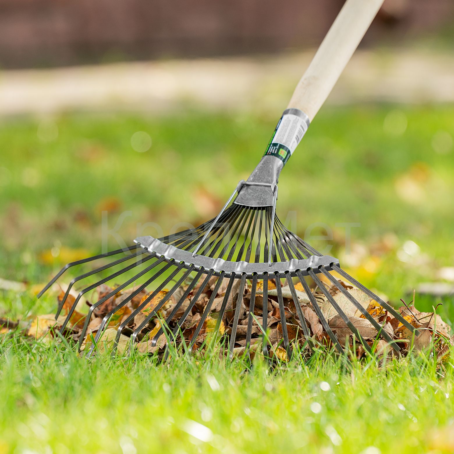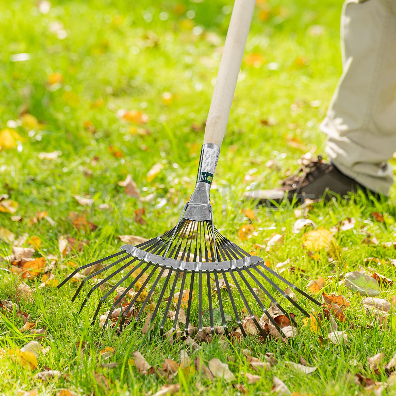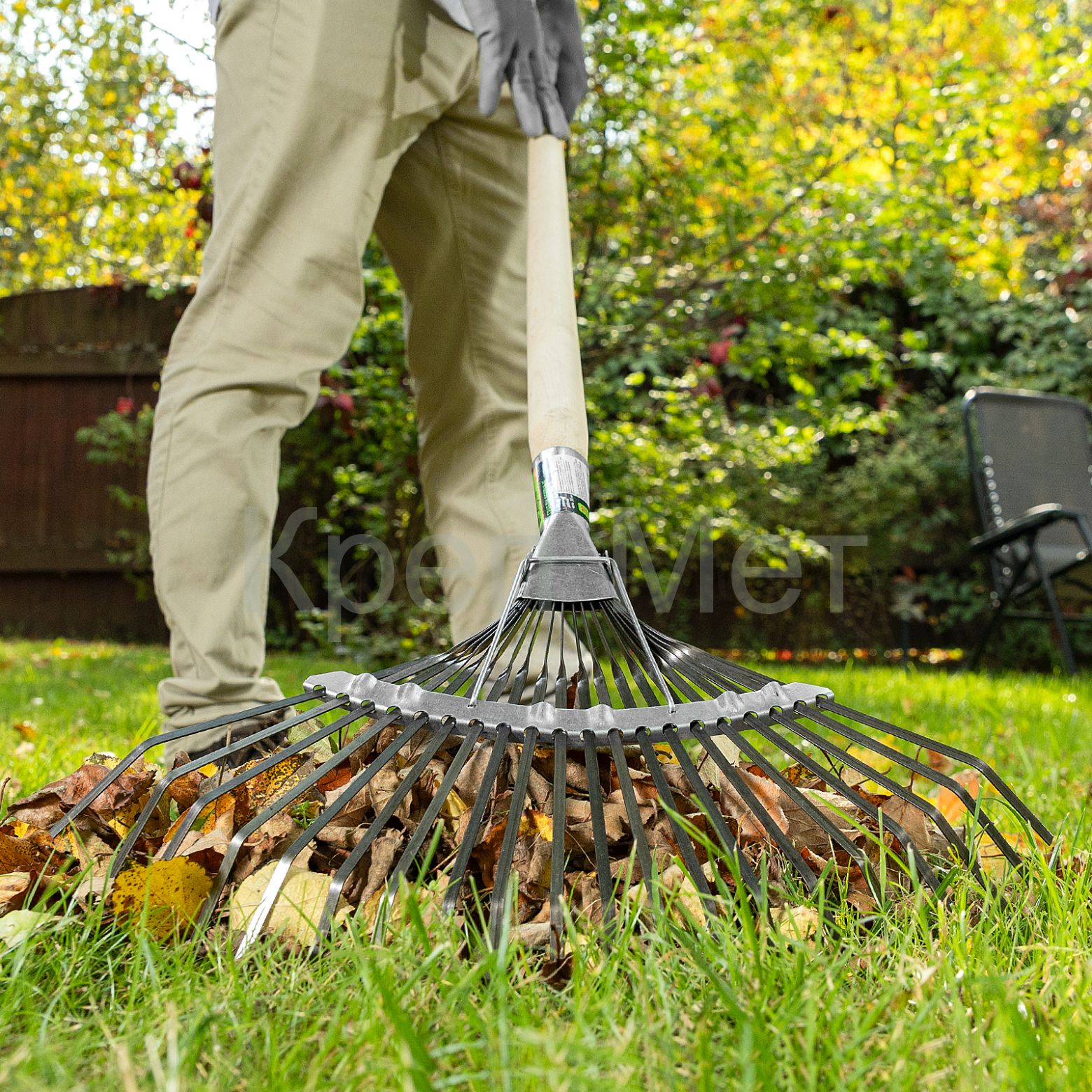 Веерные стальные грабли Сибртех 61778 с 20 плоскими зубьями, шириной 385 мм, оксидированные, без черенка, предназначены для работы на садовом участке. С их помощью удобно убирать мусор, листву и ветки с лужаек и грядок. Грабли можно установить на любой удобный черенок диаметром 25 мм.