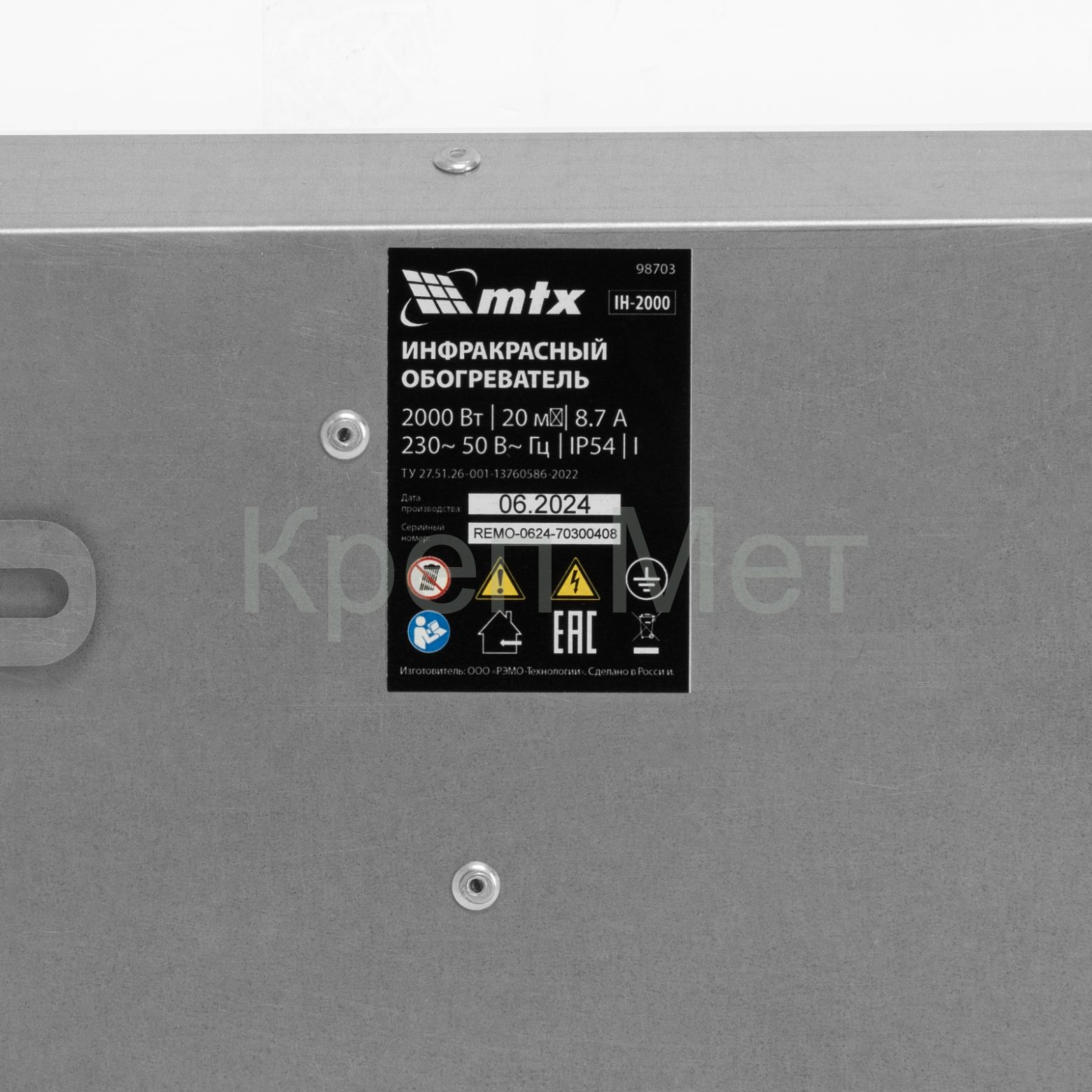 Инфракрасный обогреватель MTX IH-2000 98703 подключается к сети 230 В, потребляет мощность до 2000 Вт, защищен по стандарту IP54 и оснащен кабелем длиной 1,8 м с вилкой. Предназначен для обогрева помещений, благодаря высокой степени защиты IP54 не боится влаги, поэтому может быть установлен на улице под открытым небом, на открытых верандах, в беседках, курятниках, теплицах и подвальных помещениях, часто используется для сушки деревянных поверхностей. Служит основным источником тепла на площади до 20 м² и дополнительным — в помещениях до 40 м². Произведен в России.