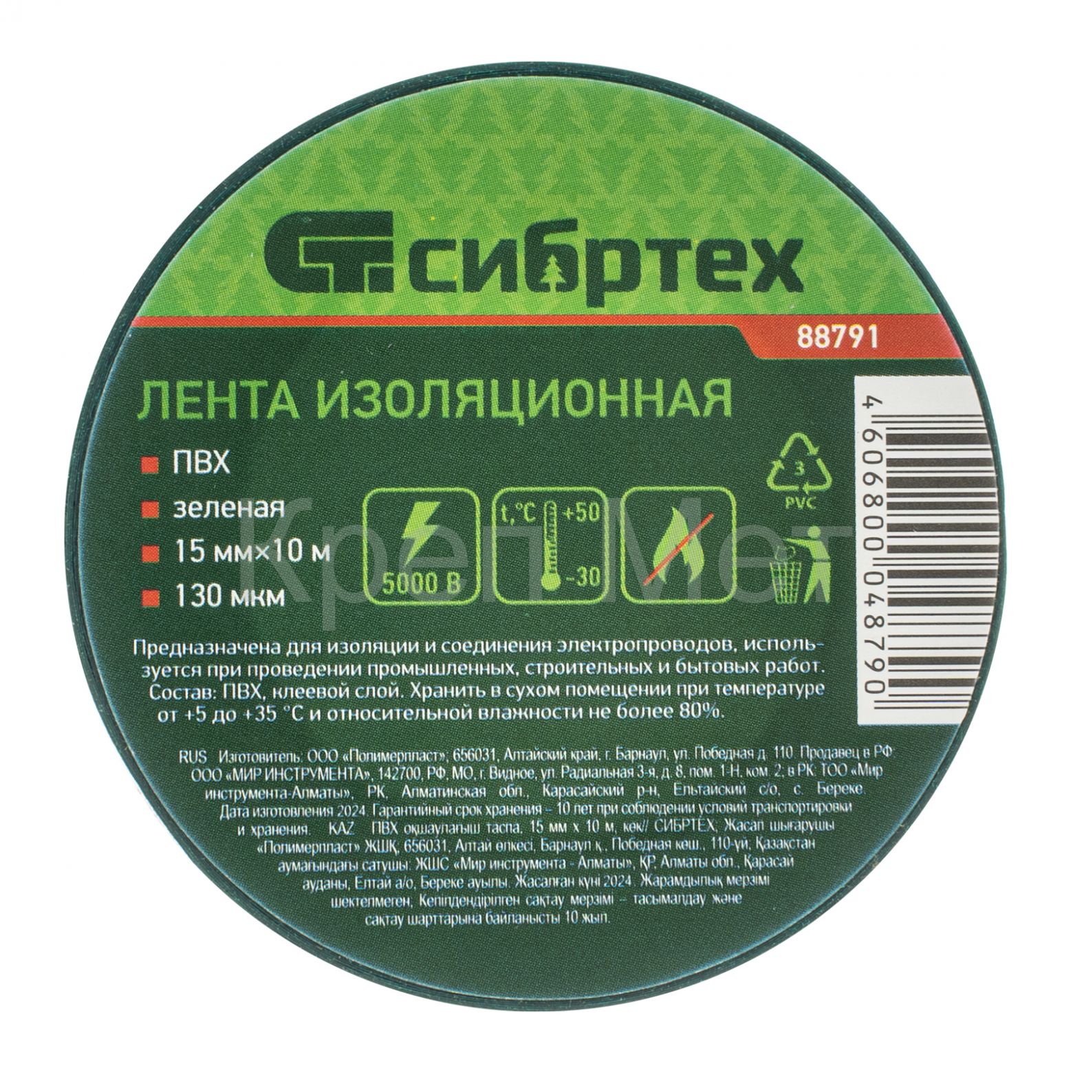 Изолента ПВХ, 15 мм х 10 м, зеленая Сибртех