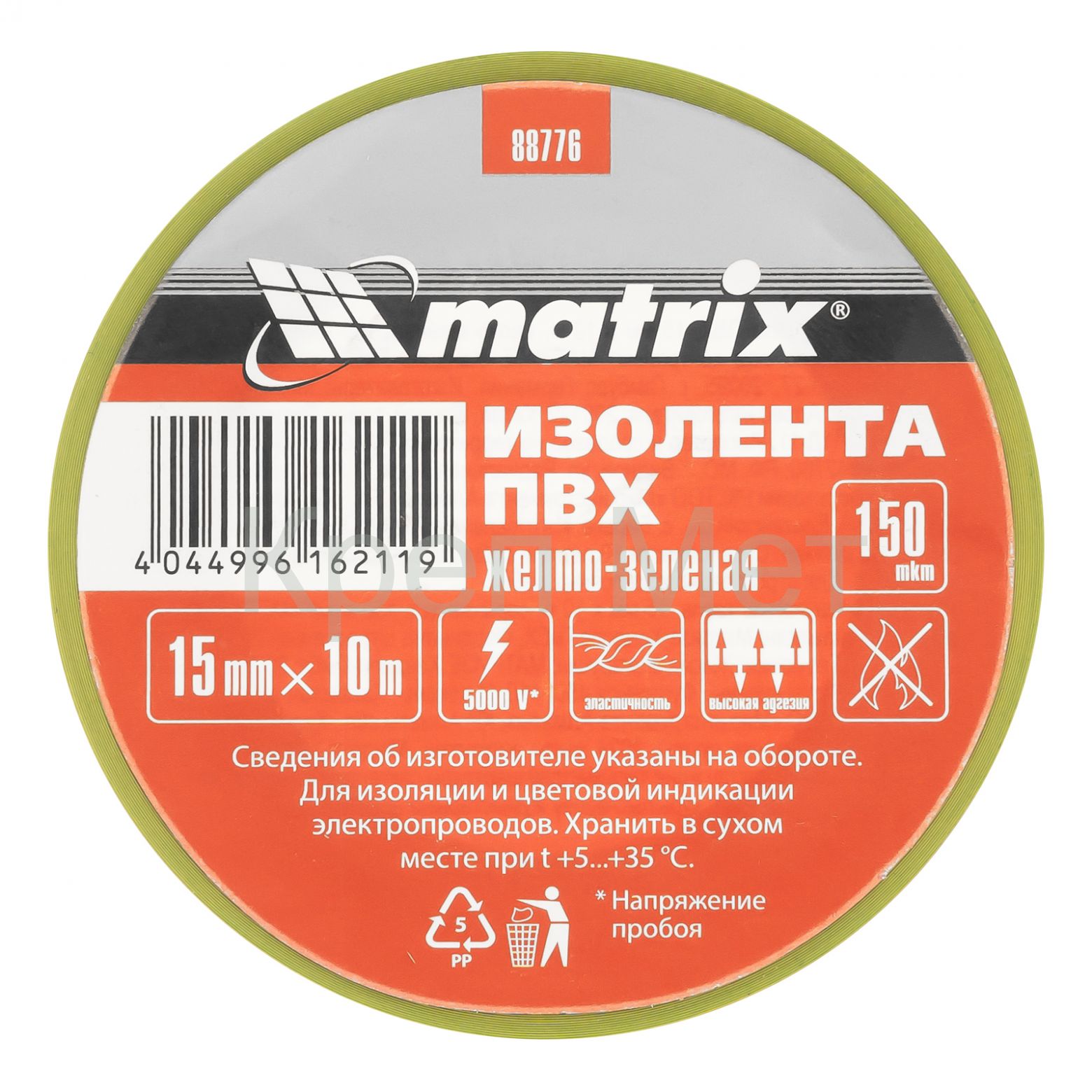 - Изолента ПВХ, 15 мм х 10 м, желто-зеленая, 150 мкм Matrix