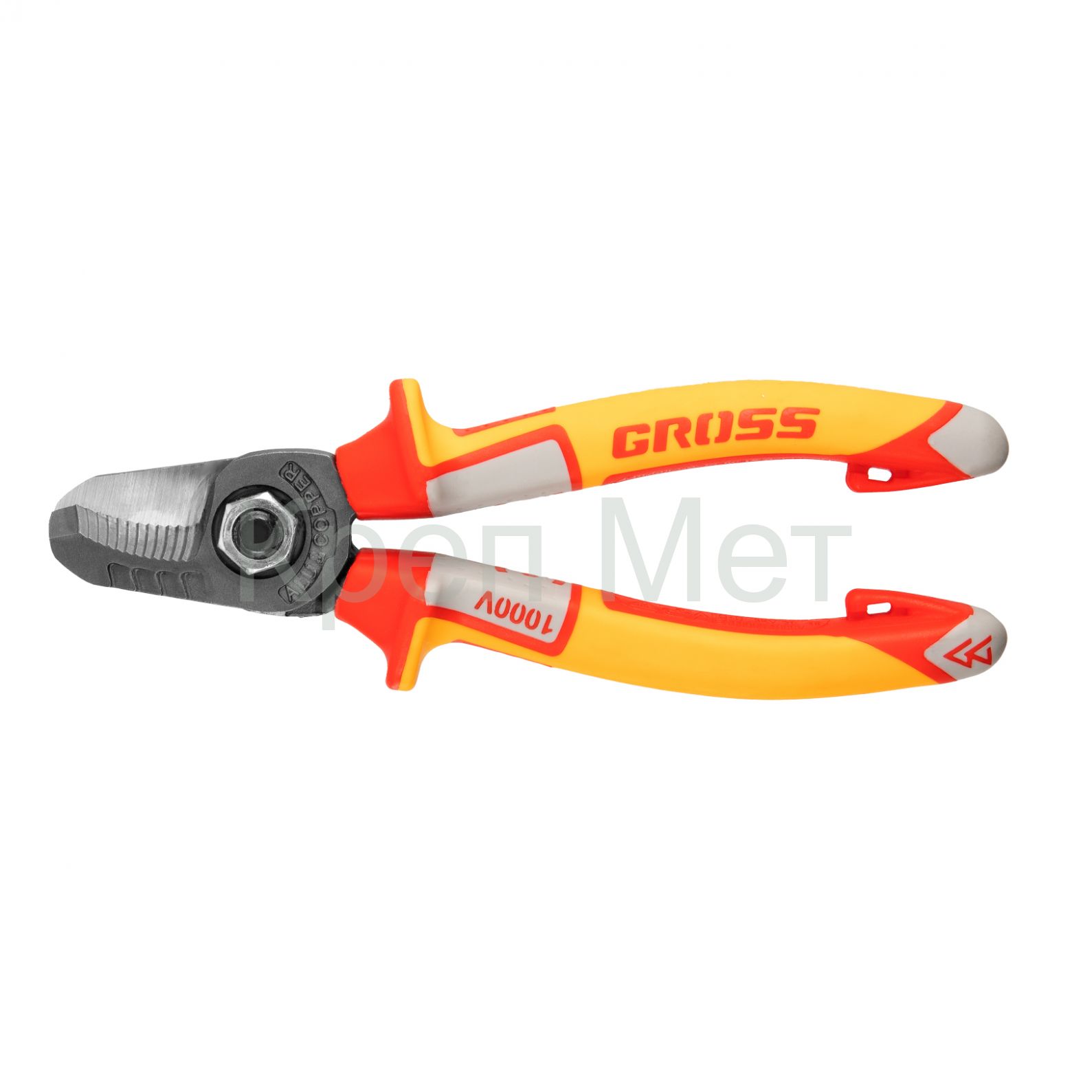 Кабелерез Gross 17725 длиной 160 мм, с трехкомпонентными диэлектрическими рукоятками до 1000 В, широко используется при проведении слесарных и электромонтажных работ. С его помощью можно перерезать многопроволочную жилу из меди и алюминия, снять изоляцию с электропроводов. Инструмент не подходит для работы с алюминиевыми сплавами, стальной проволокой и холоднотянутыми медными проводами, может использоваться только для многопроволочных жил (общий диаметр кабеля не более 16 мм, сечение до 50 кв. мм). Важно — техника безопасности не допускает выполнения работ под напряжением.