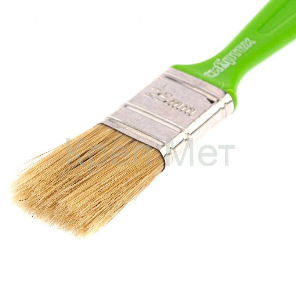 Флейцевая кисть Сибртех «Евро» 83300 шириной 25 мм и толщиной 8 мм, с натуральной щетиной и пластиковой ручкой, предназначена для первичного окрашивания либо создания финишного слоя на небольших или узких участках поверхности. Кисть обладает хорошими краскообменными качествами и подходит для любых видов лакокрасочных материалов (ЛКМ).