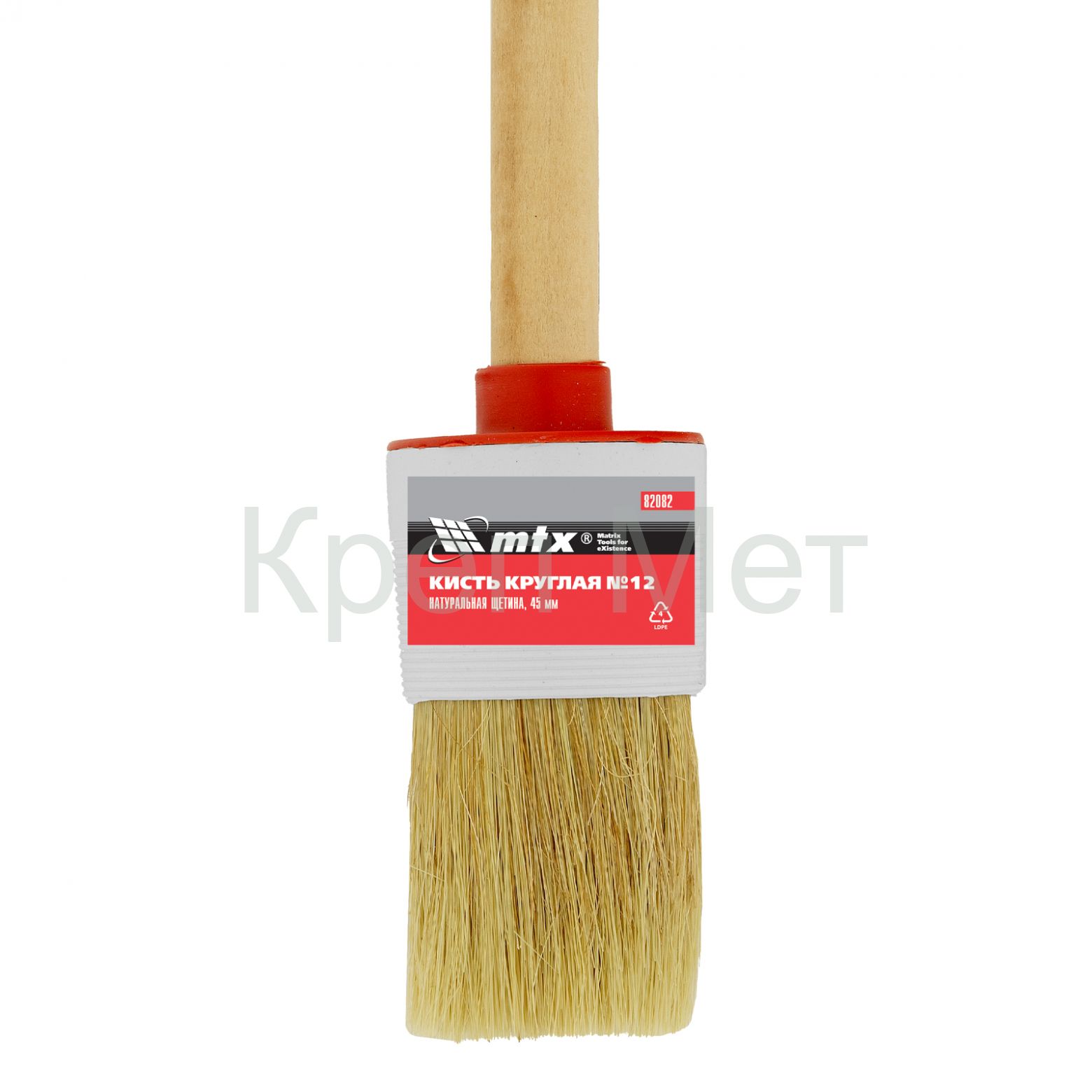 Круглая кисть MTX №12 82082 диаметром 45 мм, с натуральной щетиной и деревянной ручкой, пригодится в быту для окрашивания узких длинных поверхностей. Светлая натуральная свиная щетина с добавлением искусственной обладает высокой износоустойчивостью и может использоваться для нанесения красок с содержанием растворителей, а также масляных красок и лаков.
