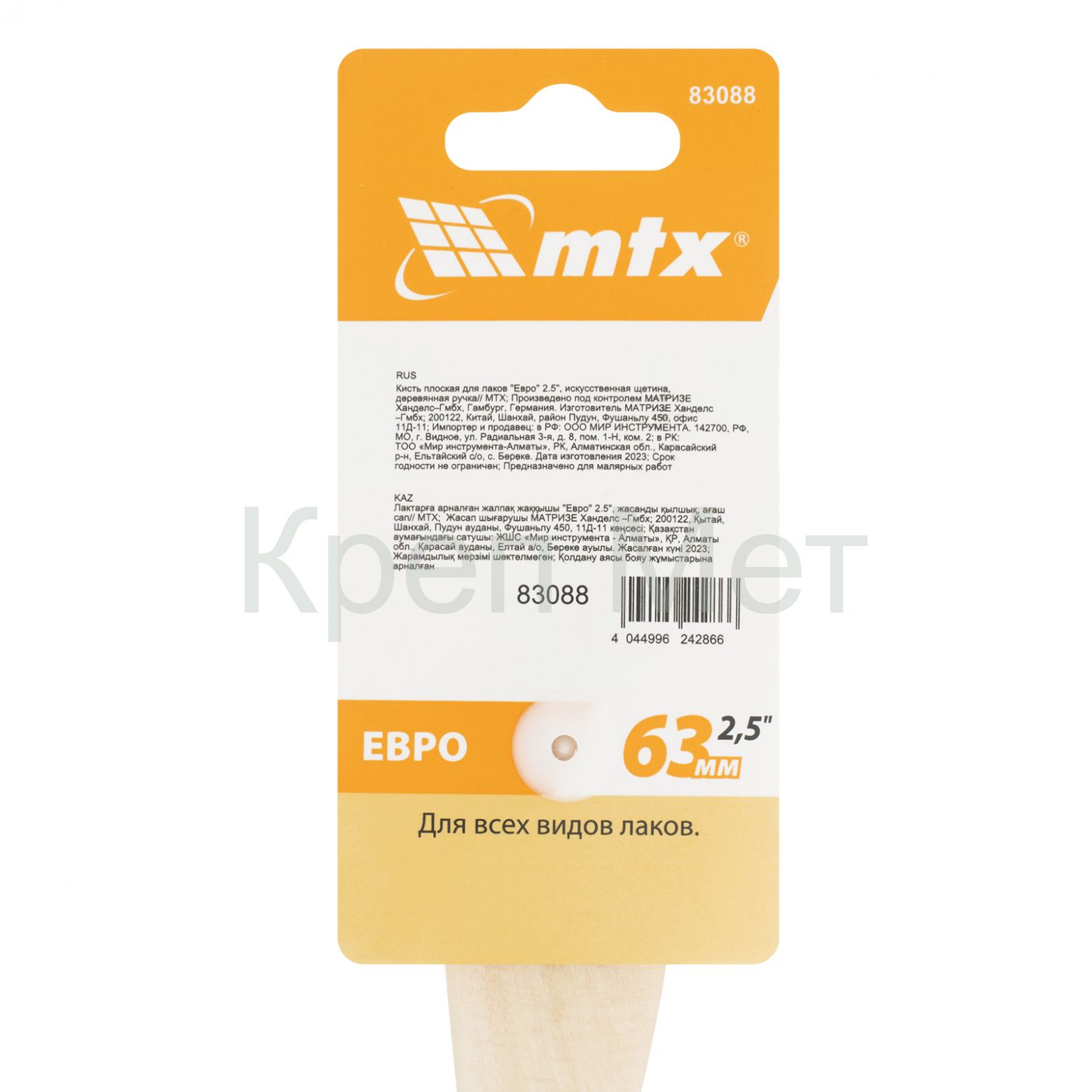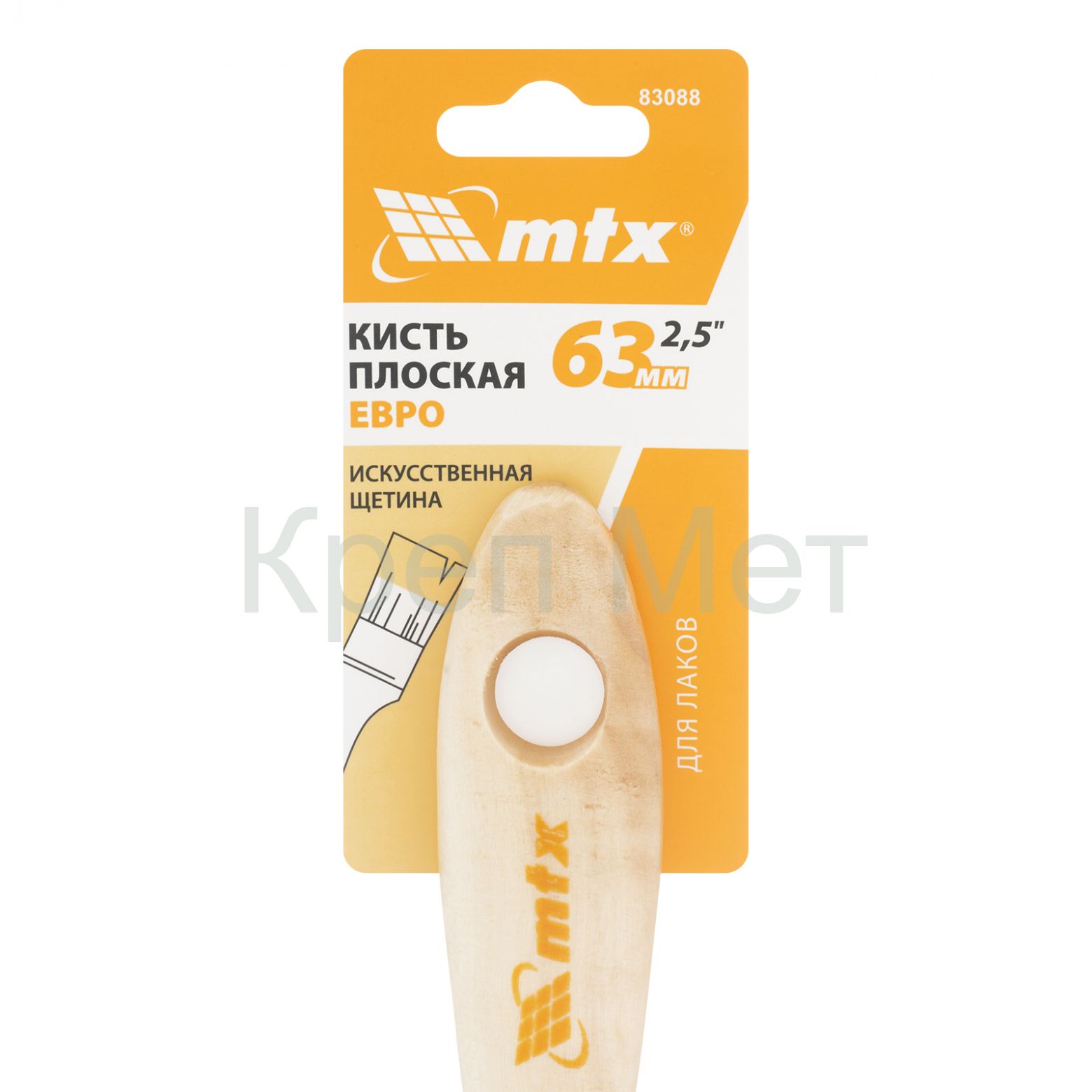Кисть плоская MTX «Евро» 83088 шириной 2,5", с искусственной щетиной и деревянной ручкой, пригодится при проведении малярных работ. Предназначена для работы с любыми типами лаков. Мягкая и упругая щетина оптимальна для нанесения покрытий на гладкие и слегка шероховатые поверхности.