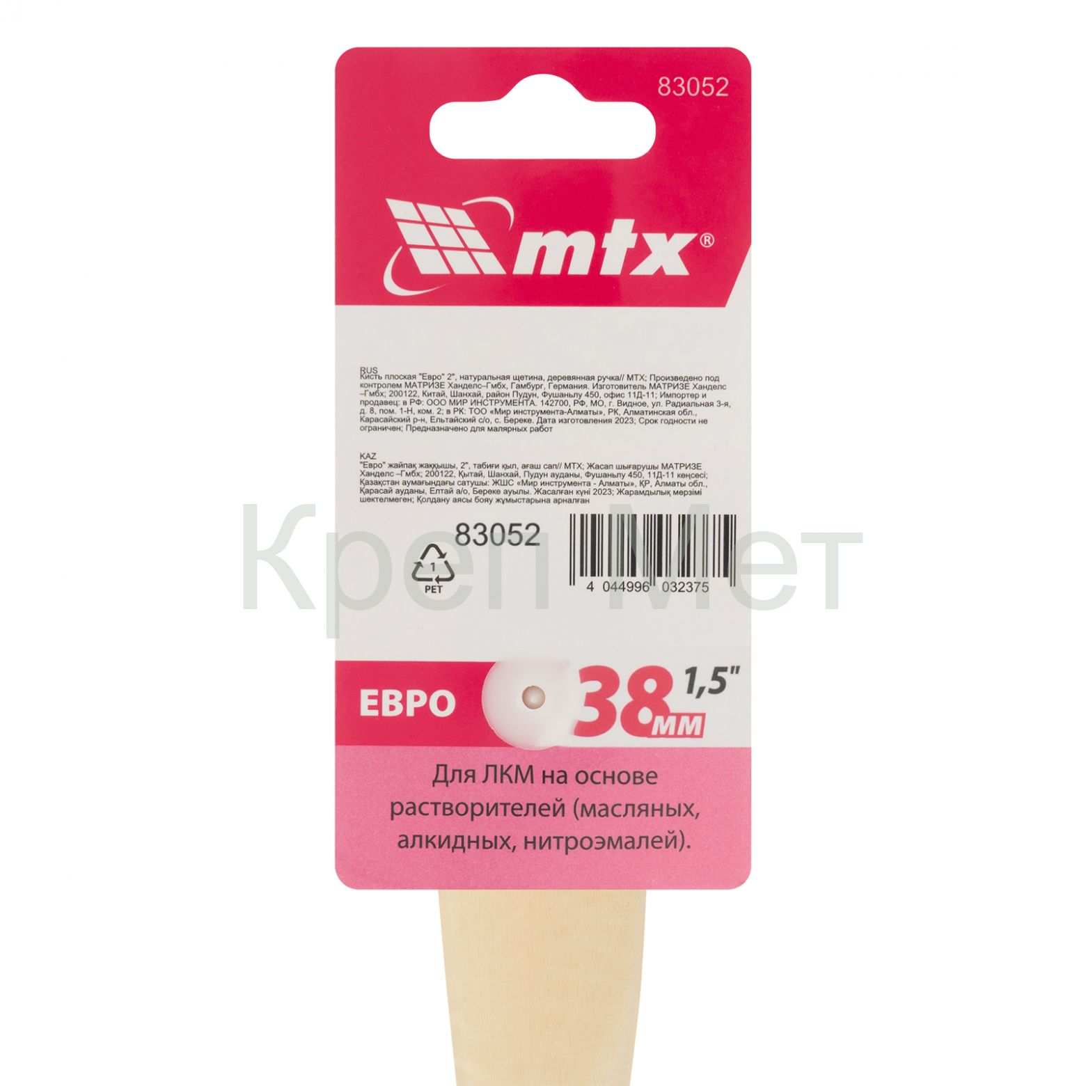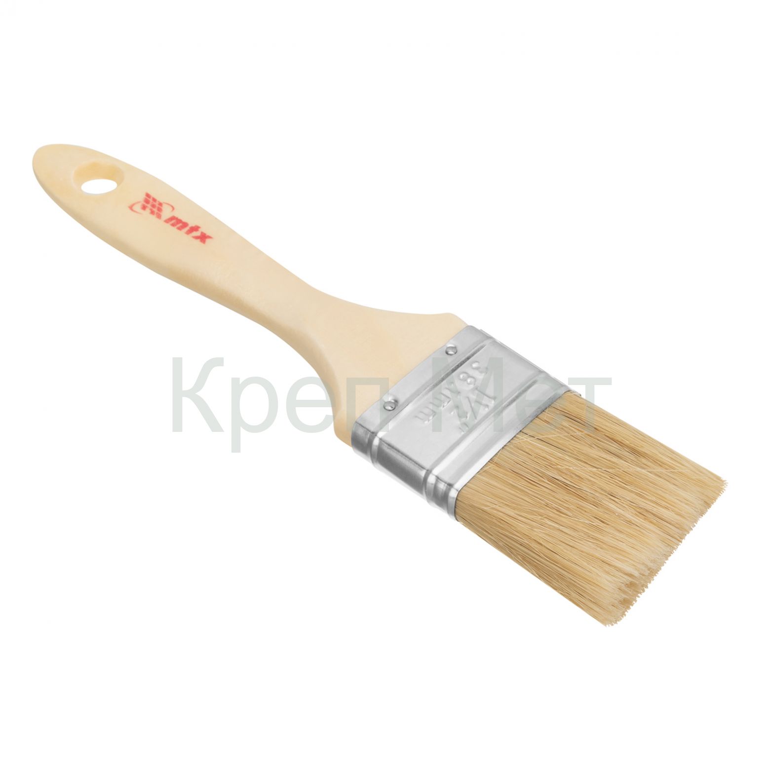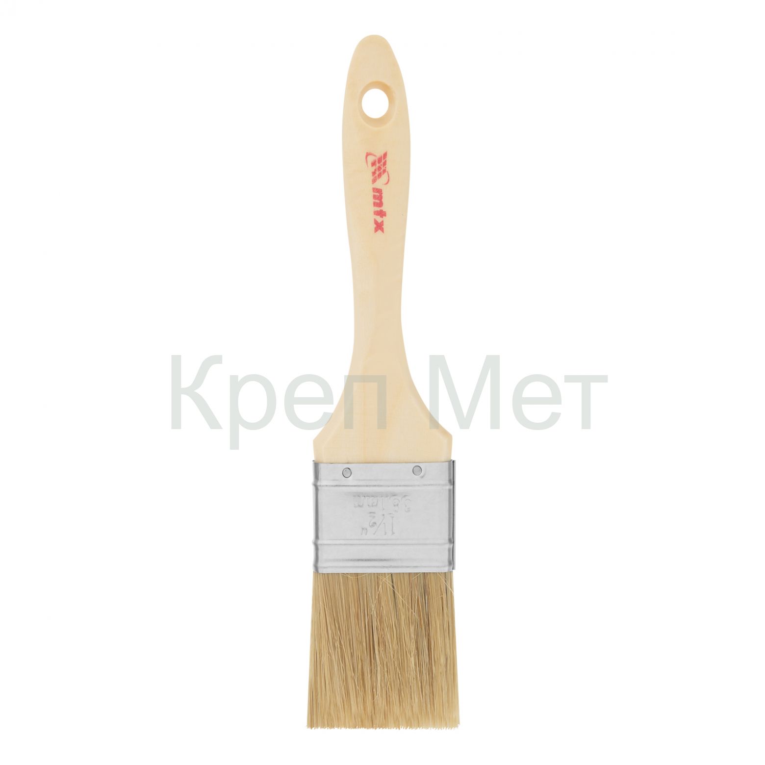 Плоская кисть MTX «Евро» 83052 шириной 1,5 дюйма, с натуральной щетиной и деревянной ручкой, используется для профессионального окрашивания поверхностей. Рекомендуется для нанесения агрессивных ЛКМ с содержанием растворителей.