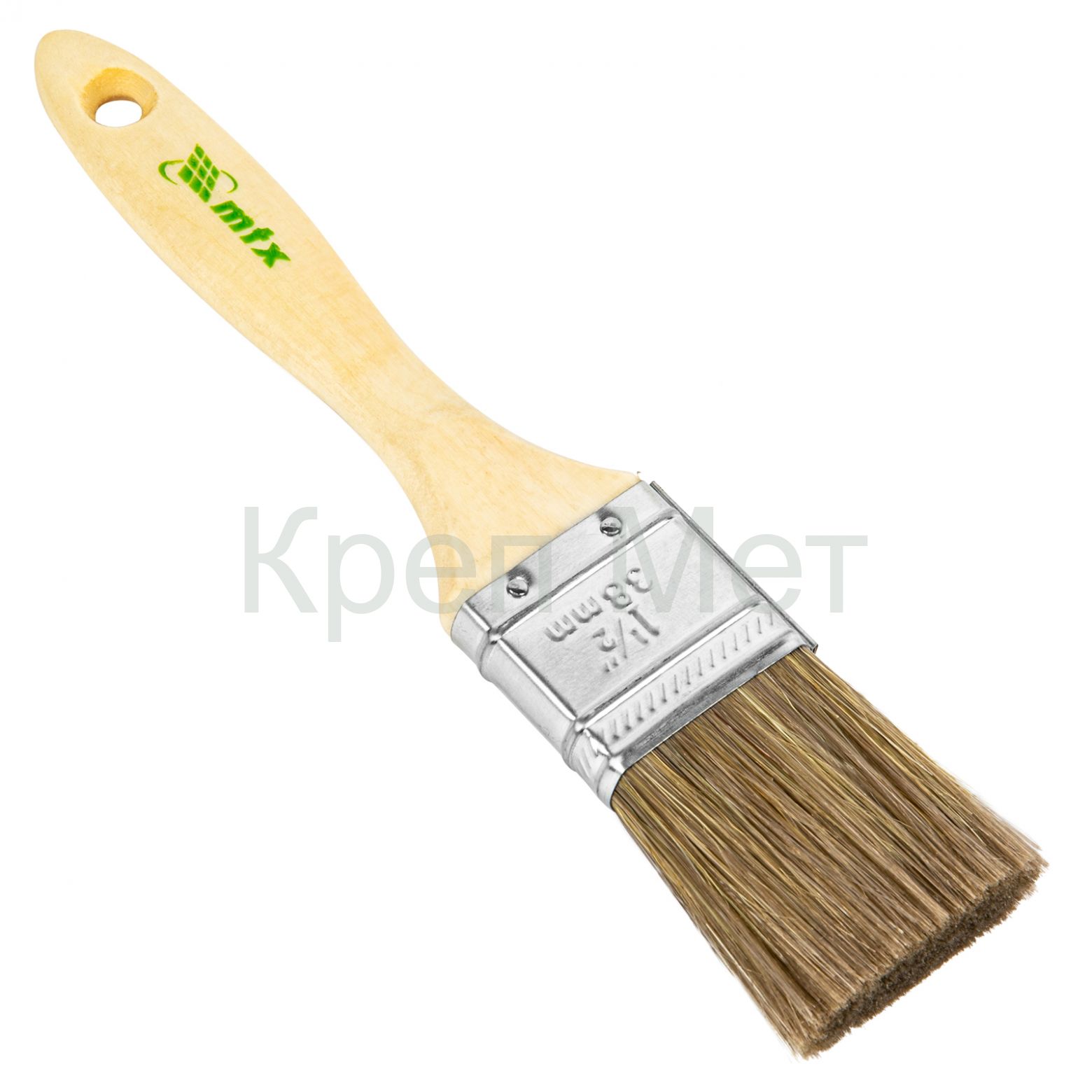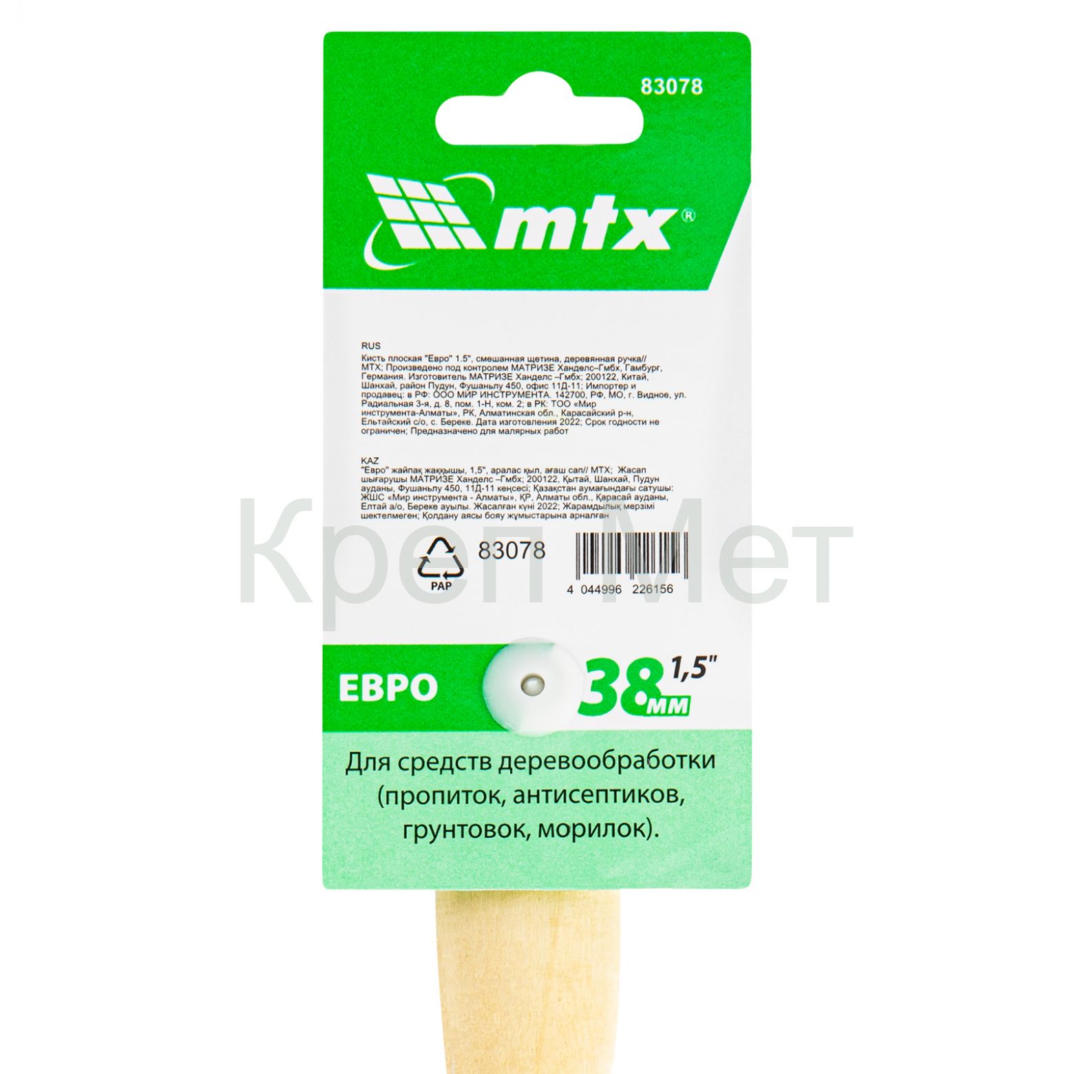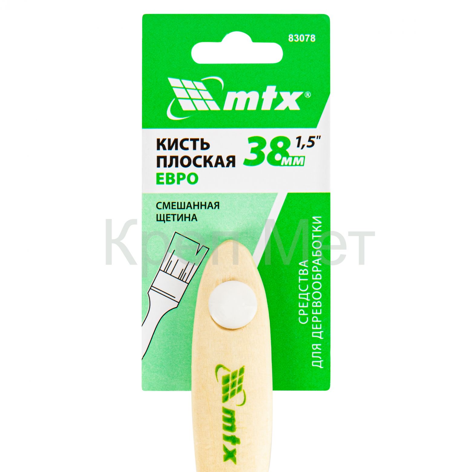 Плоская кисть MTX «Евро» 83078 шириной 1,5", с деревянной ручкой, имеет смешанную щетину и оптимальна для нанесения средств защиты древесины (пропитки, грунтовки, антисептиков, морилки). Сочетает все преимущества искусственной и натуральной щетины благодаря оптимальной комбинации натуральных и искусственных волокон. Обладает высокими краскообменными качествами: благодаря натуральной щетине в составе кисть хорошо впитывает и отдает краску. Инструмент подходит для профессионального использования.