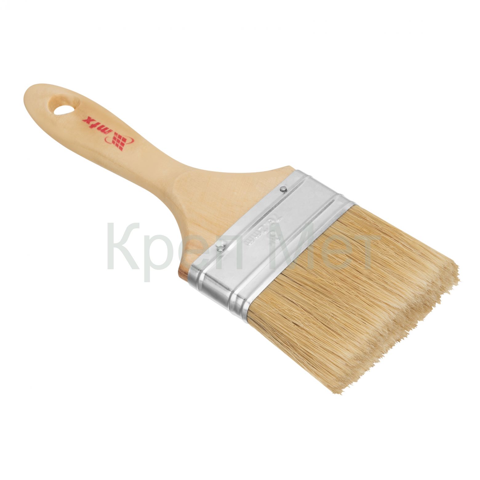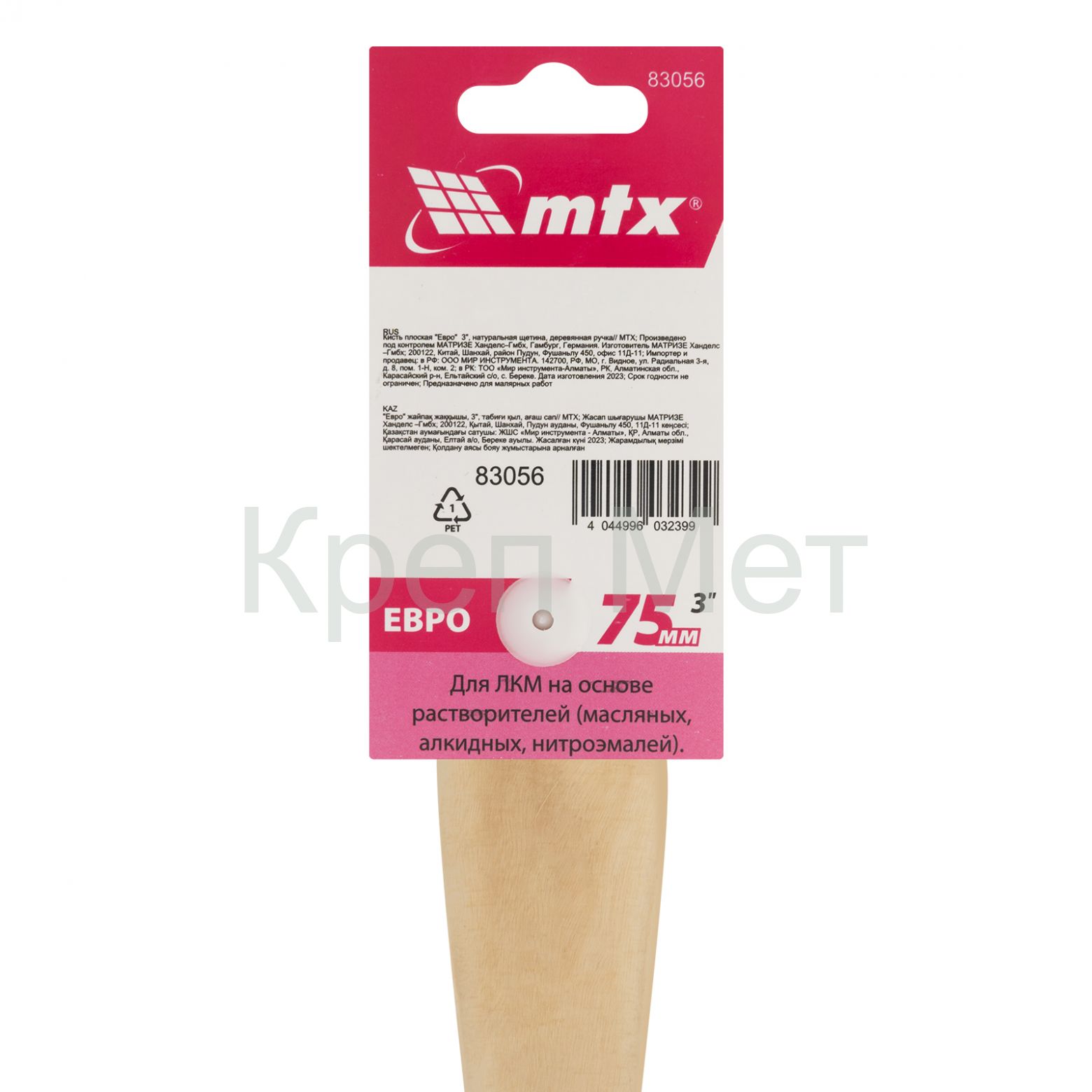 Плоская кисть MTX «Евро» 83056 шириной 3 дюйма, с натуральной щетиной и деревянной ручкой, используется для профессионального окрашивания поверхностей. Рекомендуется для нанесения агрессивных ЛКМ с содержанием растворителей.