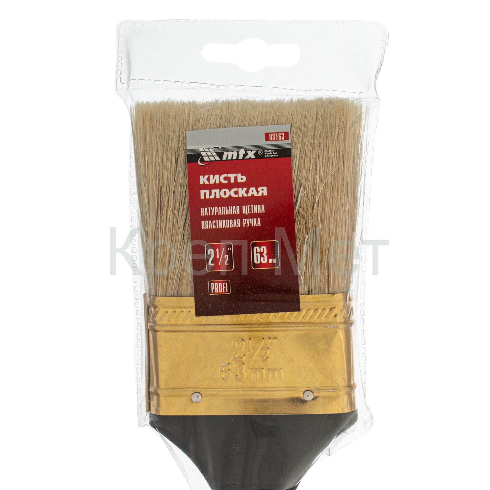 Плоская кисть «Профи» MTX 83163 шириной 2,5 дюйма, с натуральной щетиной и пластмассовой ручкой, рассчитана на профессиональное выполнение малярных работ. Натуральная щетина с увеличенной плотностью набивки подходит для нанесения различных типов ЛКМ, в том числе содержащих растворители.