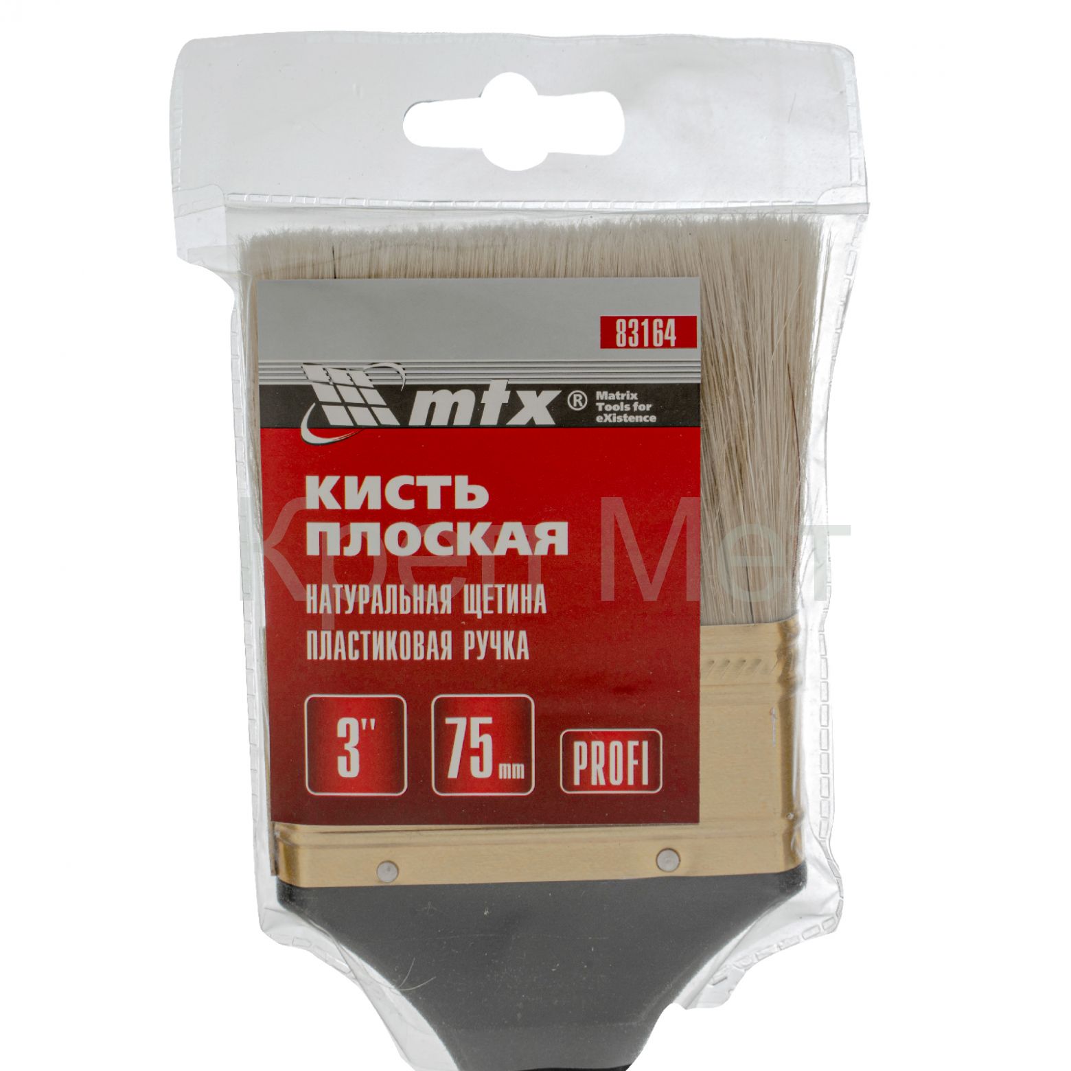 Плоская кисть «Профи» MTX 83164 шириной 3 дюйма, с натуральной щетиной и пластмассовой ручкой, рассчитана на профессиональное выполнение малярных работ. Натуральная щетина с увеличенной плотностью набивки подходит для нанесения различных типов ЛКМ, в том числе содержащих растворители.