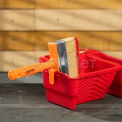 - Продуманная конструкция — во время перерыва в работе кисть можно закрепить на краю емкости с краской.