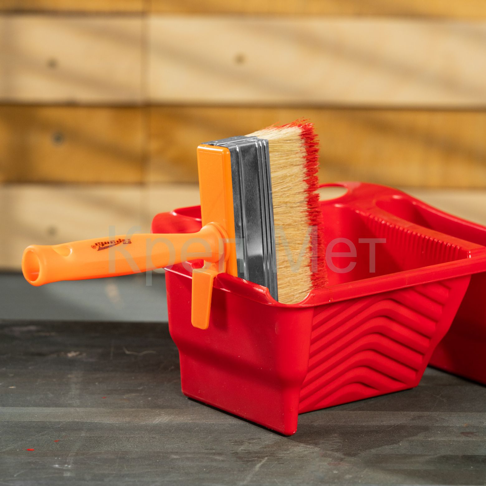 - Продуманная конструкция — во время перерыва в работе кисть можно закрепить на краю емкости с краской.