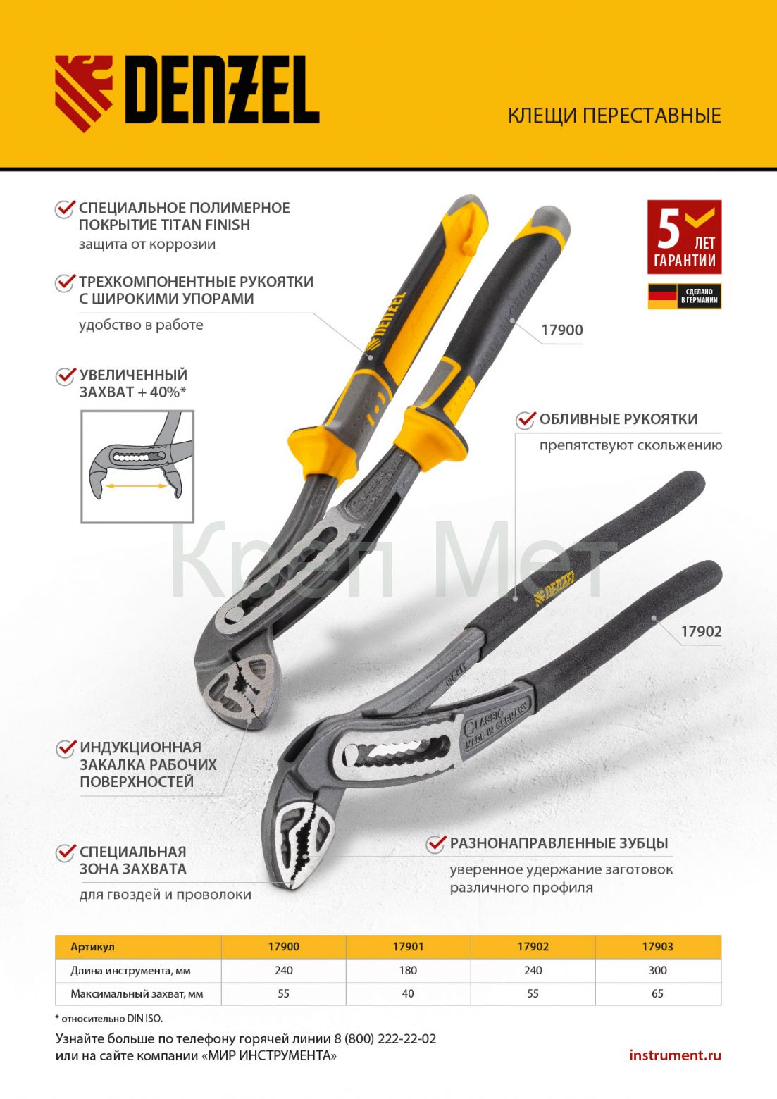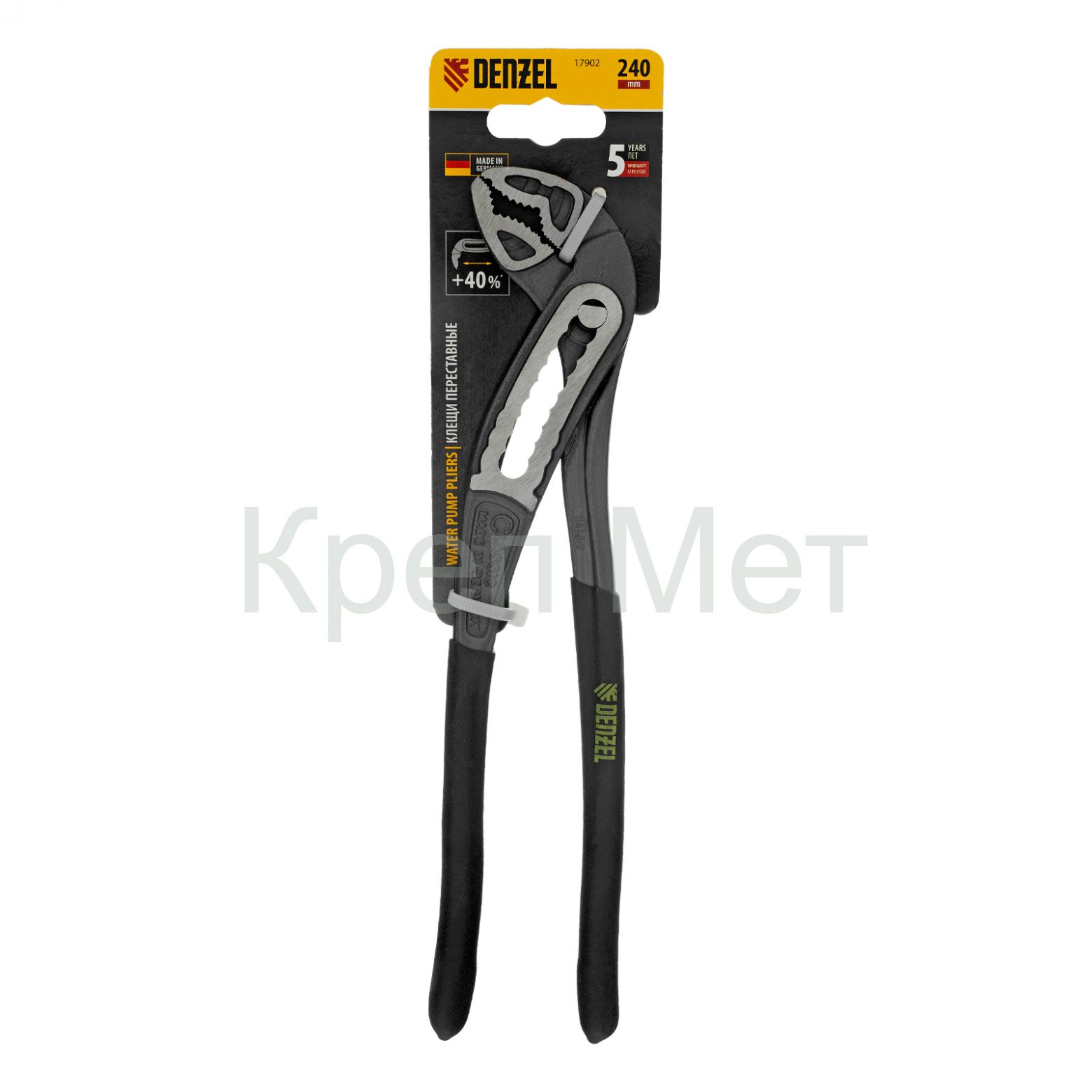 Переставные клещи Denzel 17902 длиной 240 мм, с обливными рукоятками, предназначены для фиксации и вращения деталей и заготовок различной формы. Подходят для захвата фитингов, труб, крепежных элементов. Инструмент используется при проведении ремонтных, монтажных, сантехнических работ.