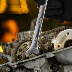 • Плавное вращение — благодаря храповому механизму с 90 зубьями шаг трещотки составляет всего 4°, инструмент удобен для работы в труднодоступных местах.