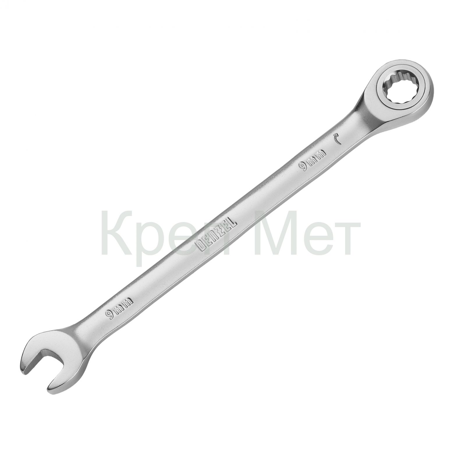 Ключ комбинированный трещоточный, 9 мм, CrV, матовый хром Denzel