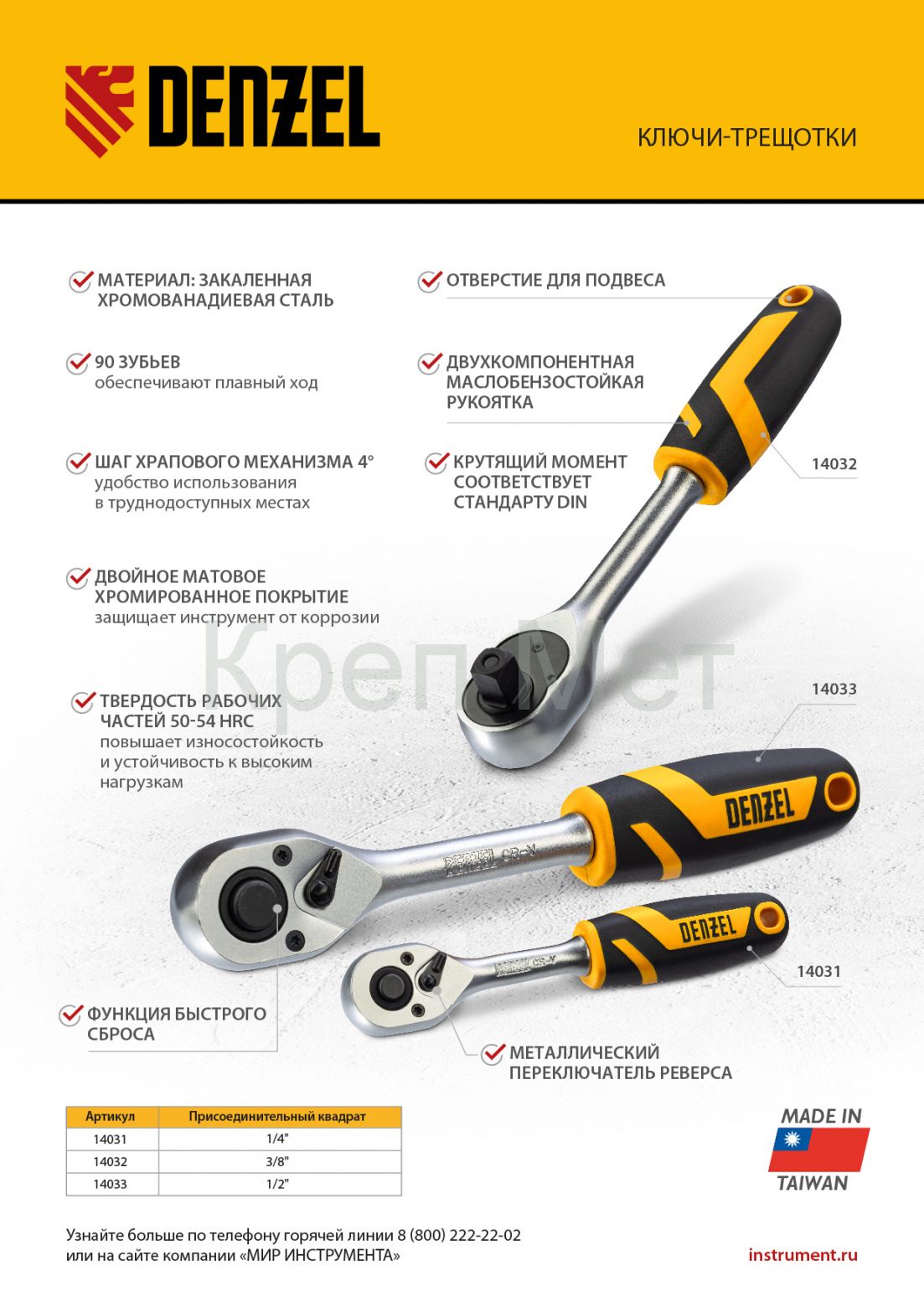 - Ключ-трещотка 1/2", 90 зубьев, с быстрым сбросом, CrV Denzel