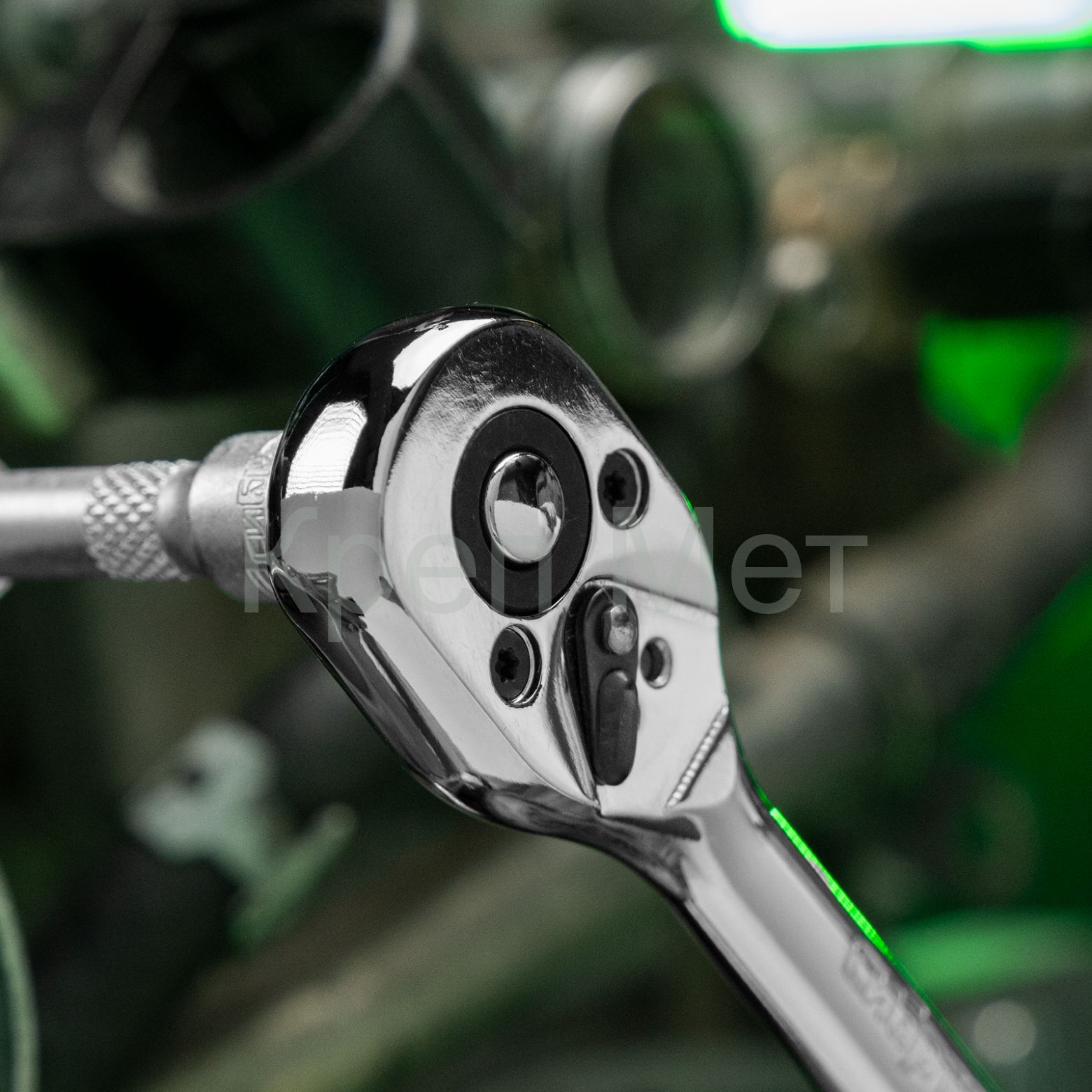 - Функция реверса — при помощи переключателя с металлическим флажком можно одним движением изменить направление вращения трещотки.
