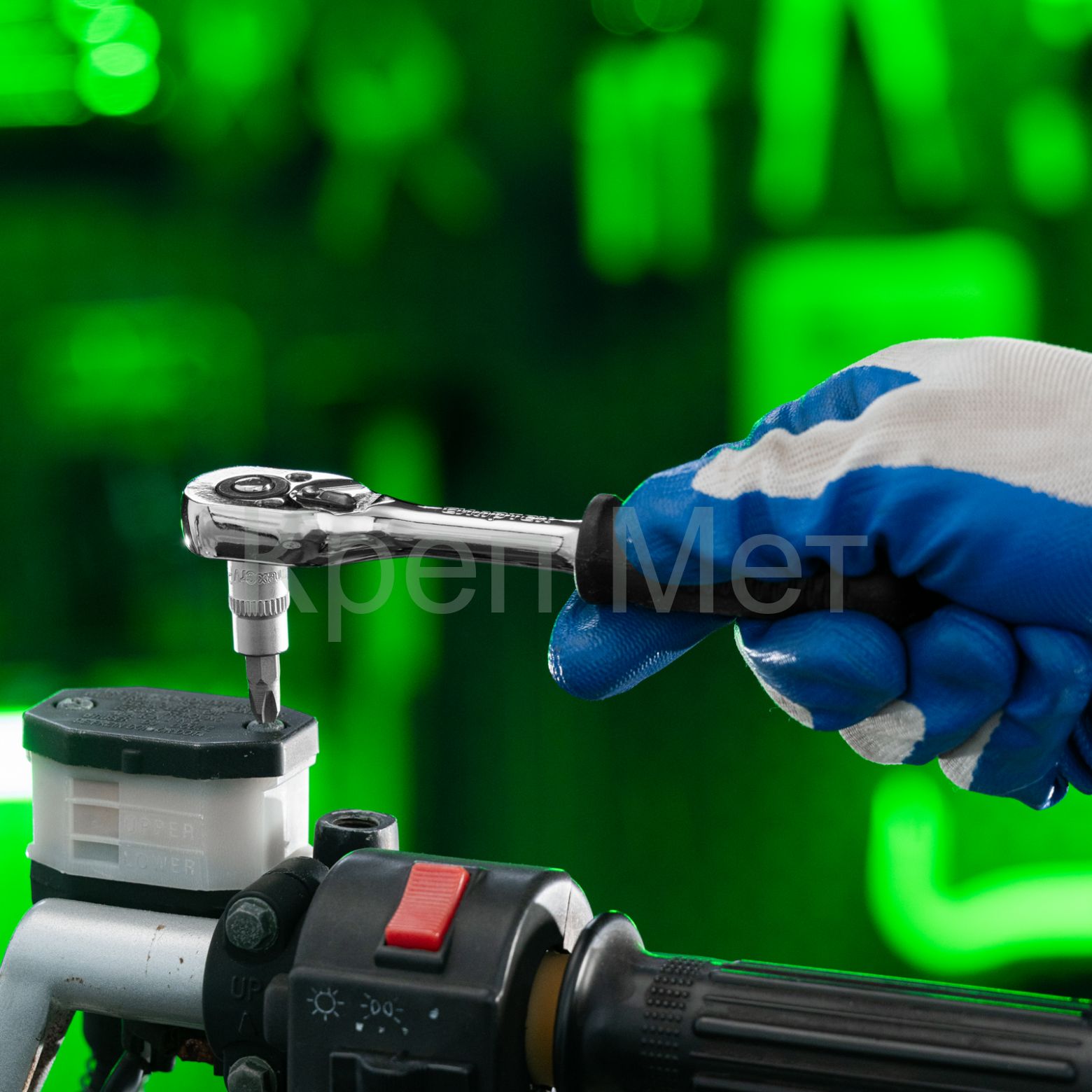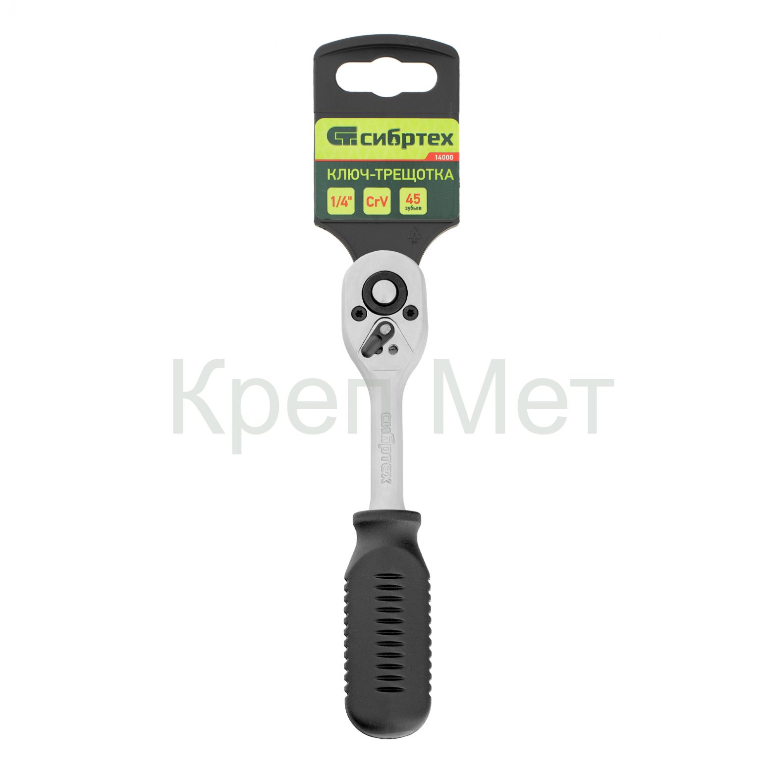 Хромированный ключ-трещотка Сибртех 14000 из стали CrV, с посадочным размером 1/4″ и 45-зубым храповым механизмом, с функцией быстрого сброса, используется для работы с резьбовым крепежом. Трещоточный механизм с 45 зубьями обеспечивает плавное вращение, облегчая работу. Инструмент пригодится дома, в мастерской и гараже.