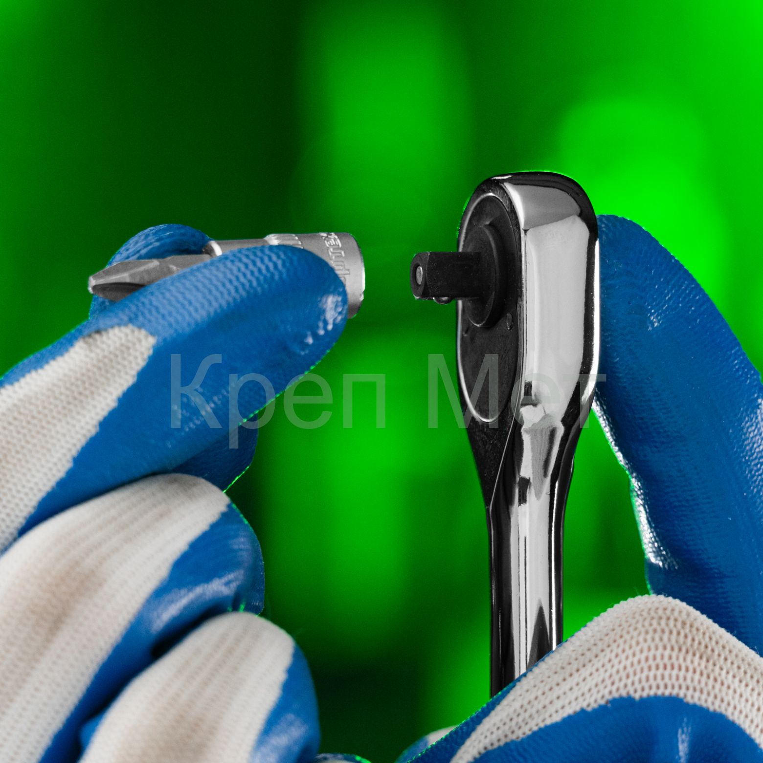- Надежная фиксация — шариковый замок крепко удерживает торцевую головку, поэтому она не соскочит во время работы.