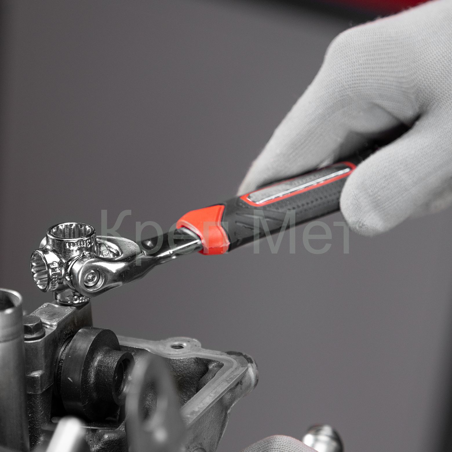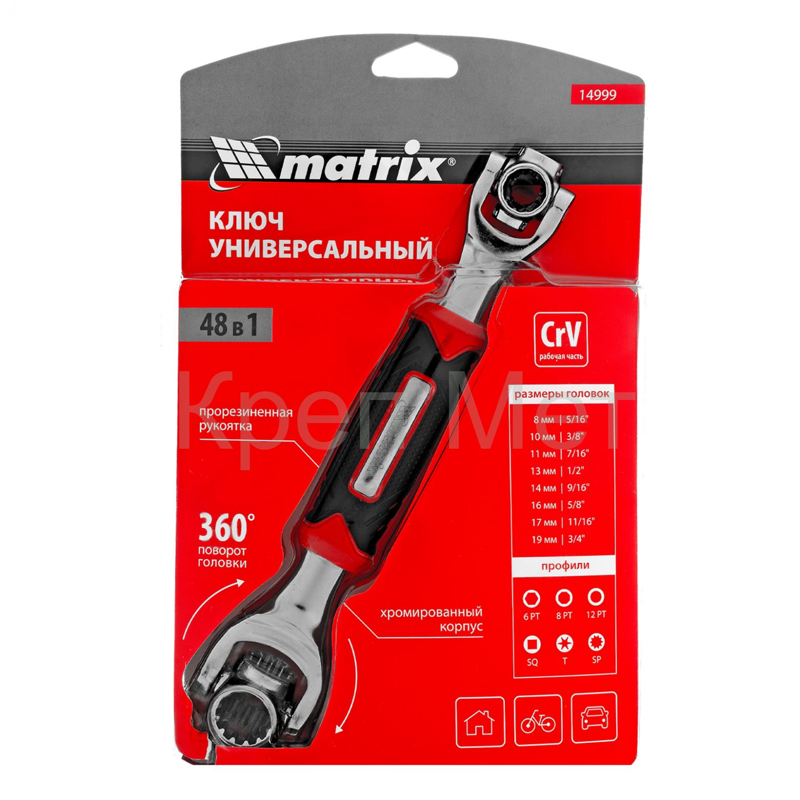 Ключ универсальный 48 в 1 Matrix 14999 из стали CrV имеет 8 размеров головок: 8 мм, 10 мм, 11 мм, 13 мм, 14 мм, 16 мм, 17 мм, 19 мм. Подходит для различных профилей: 6-гранных, 8-гранных, 12-гранных, Square, Torx, Spline. Предназначен для монтажа и демонтажа болтовых соединений. Поворот головки на 360° и угол наклона 45° позволяют работать в труднодоступных местах. Конструкция головки позволяет закручивать и откручивать крепежи на высоких шпильках.