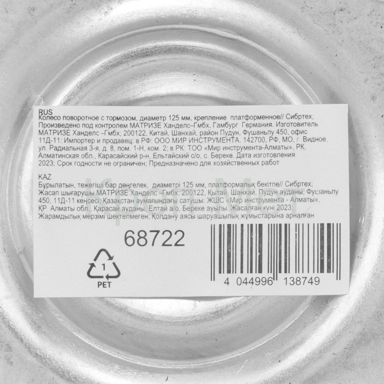- Колесо поворотное с тормозом D 125 мм, крепление платформенное Сибртех