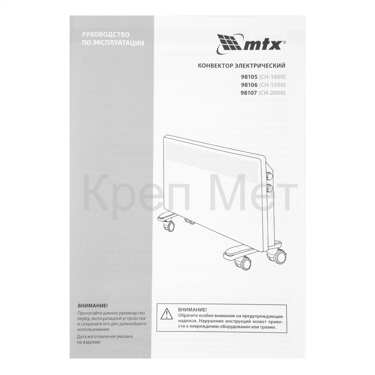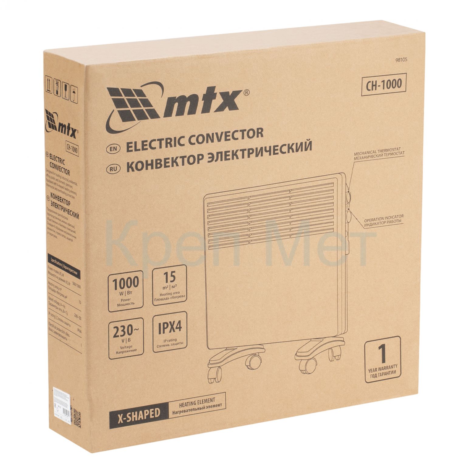 Электрический конвектор MTX CH-1000 98105 максимальной мощностью 1000 Вт, с X-образным нагревателем, термостатом и колесами, — источник тепла для жилых, офисных и хозяйственных помещений. X-образный нагревательный элемент позволяет быстро и равномерно нагреть помещение до нужной температуры. Площадь обогрева составляет 15 м2.