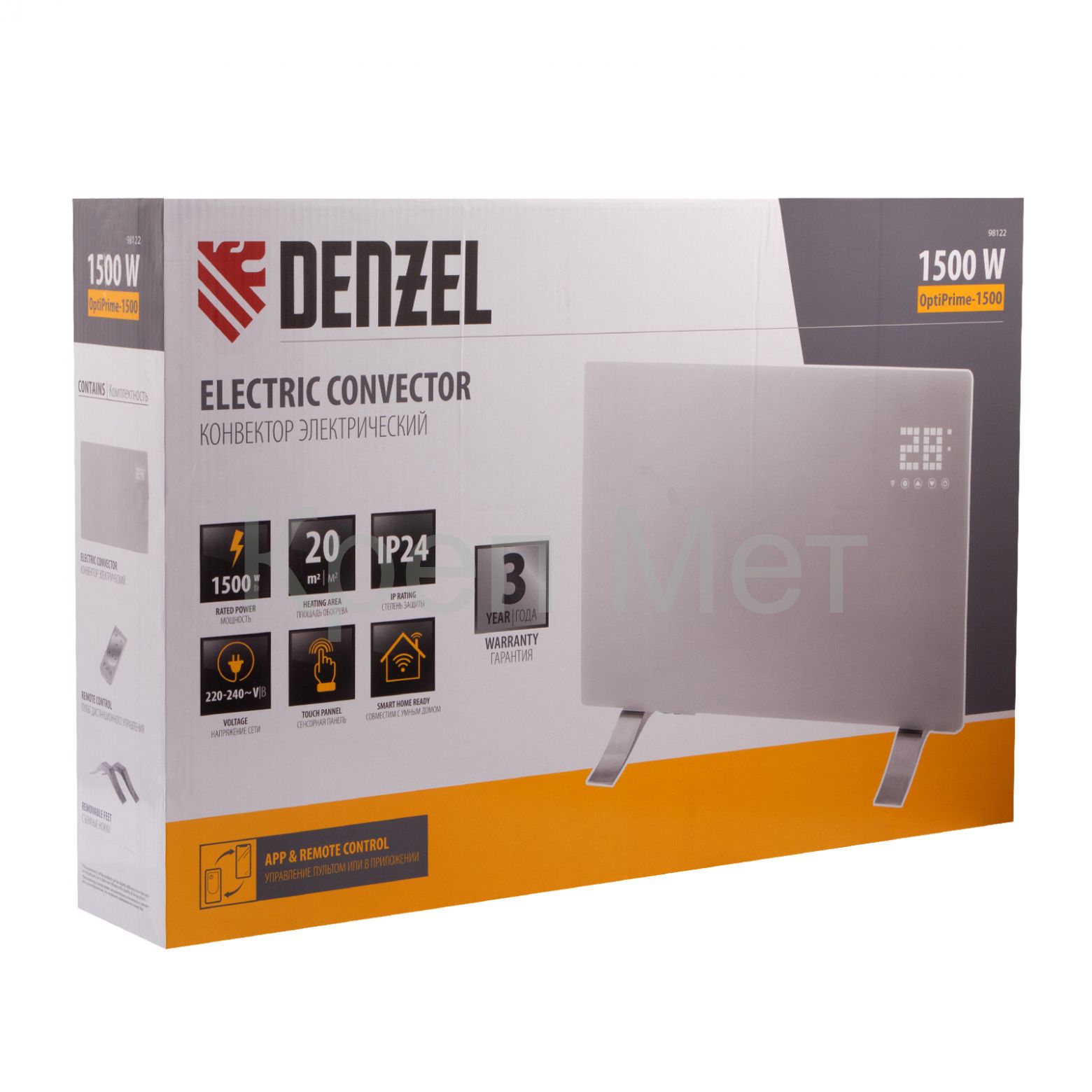 Электрический конвектор Denzel OptiPrime-1500 98122 максимальной мощностью 1500 Вт, с тачскрином, цифровым термостатом и функцией подключения к Wi-Fi, рассчитан на обогрев квартиры, дачи, загородного дома, офиса, а также пригодится в производственных, бытовых и общественных помещениях. Рекомендуемая площадь обогрева — 20 кв.м. Две мощности обогрева 750 и 1500 Вт позволяют поддерживать температуру в отапливаемой комнате и полностью прогревать холодные помещения.,Устройство оснащено Х-образным нагревательным элементом — самым долговечным среди аналогов, обеспечивающим максимально равномерный прогрев помещения. Конвектор не сушит воздух, не сжигает пыль и исключает появление неприятного запаха.