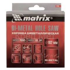 Коронка Matrix BIMETAL 72491 диаметром 102 мм — режущий инструмент, который устанавливается на дрель, перфоратор или стационарный станок. Используется для быстрого сверления черных и цветных металлов, пластика и других материалов. Позволяет получить отверстия большого диаметра при проведении электромонтажных работ и прокладке коммуникаций.