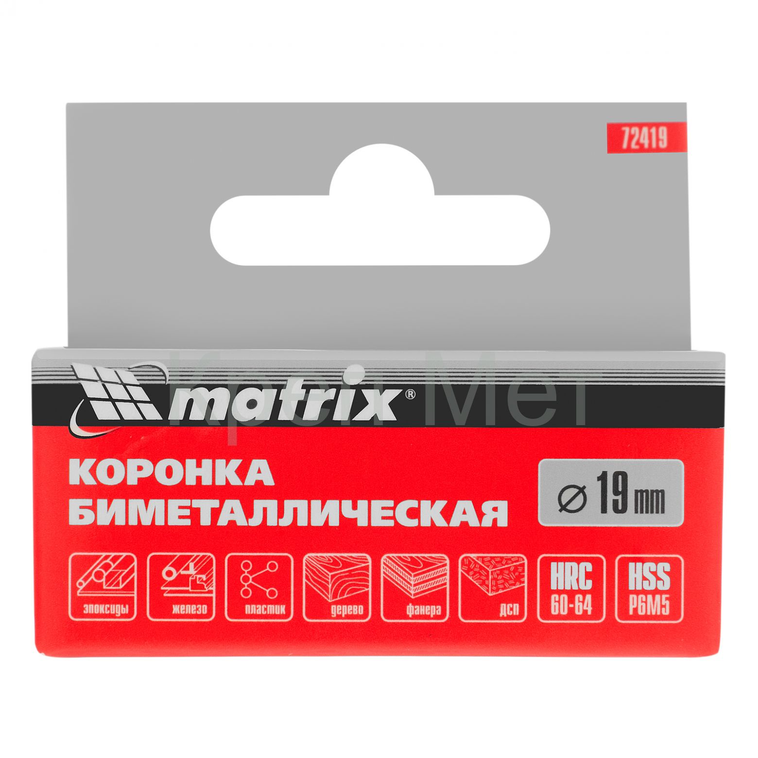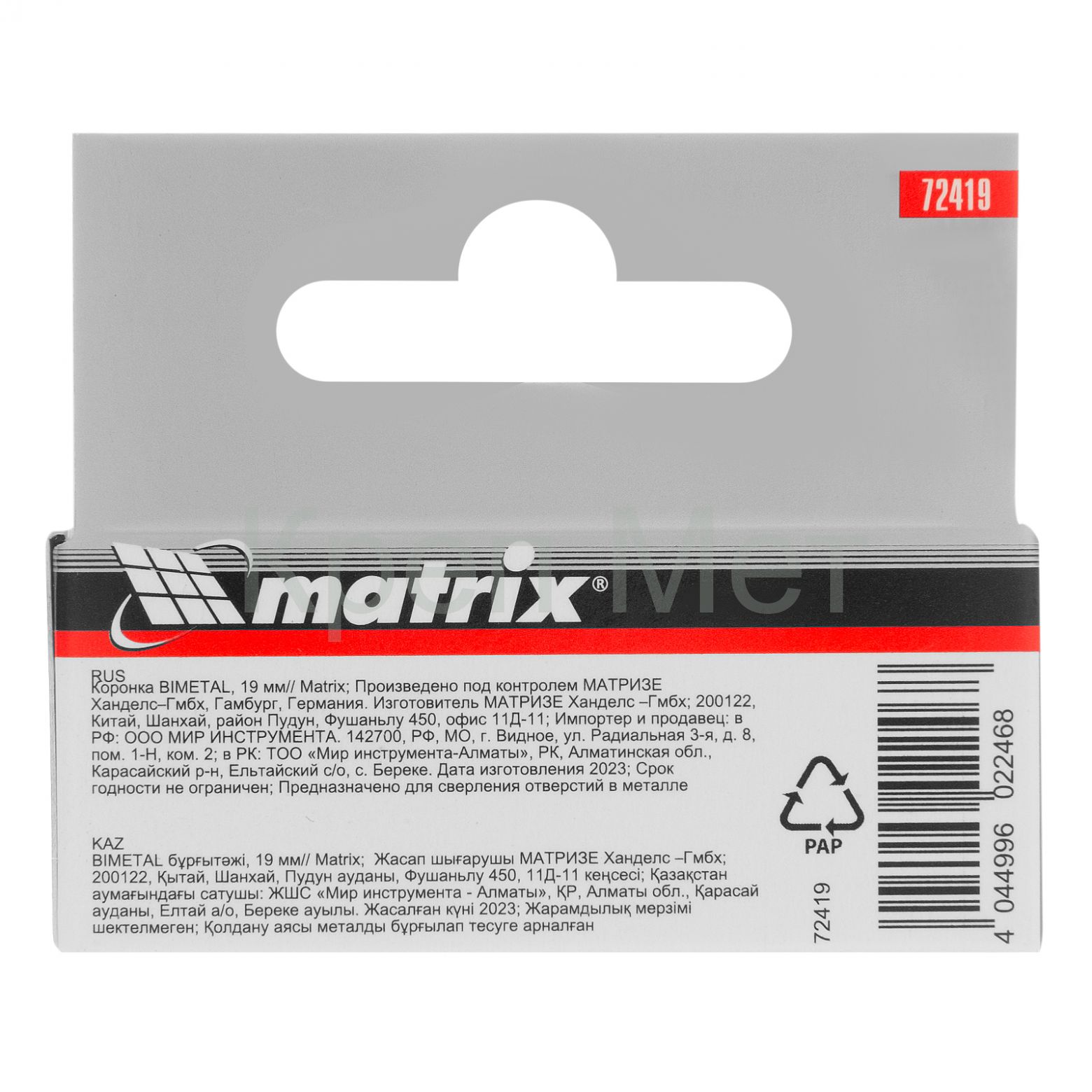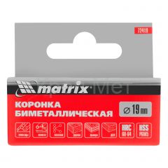 Коронка Matrix BIMETAL 72419 диаметром 19 мм — режущий инструмент, который устанавливается на дрель, перфоратор или стационарный станок. Используется для быстрого сверления черных и цветных металлов, пластика и других материалов. Позволяет получить отверстия большого диаметра при проведении электромонтажных работ и прокладке коммуникаций.