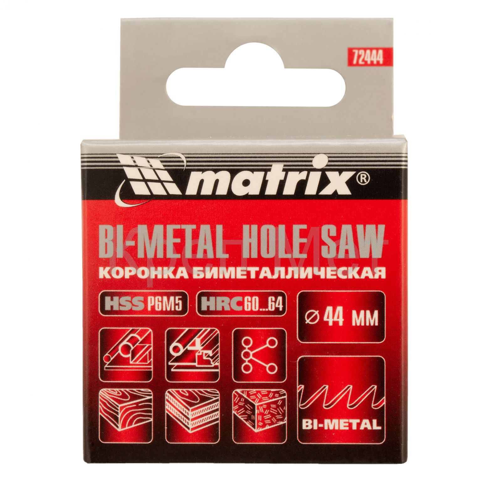 Коронка Matrix BIMETAL 72444 диаметром 44 мм — режущий инструмент, который устанавливается на дрель, перфоратор или стационарный станок. Используется для быстрого сверления черных и цветных металлов, пластика и других материалов. Позволяет получить отверстия большого диаметра при проведении электромонтажных работ и прокладке коммуникаций.