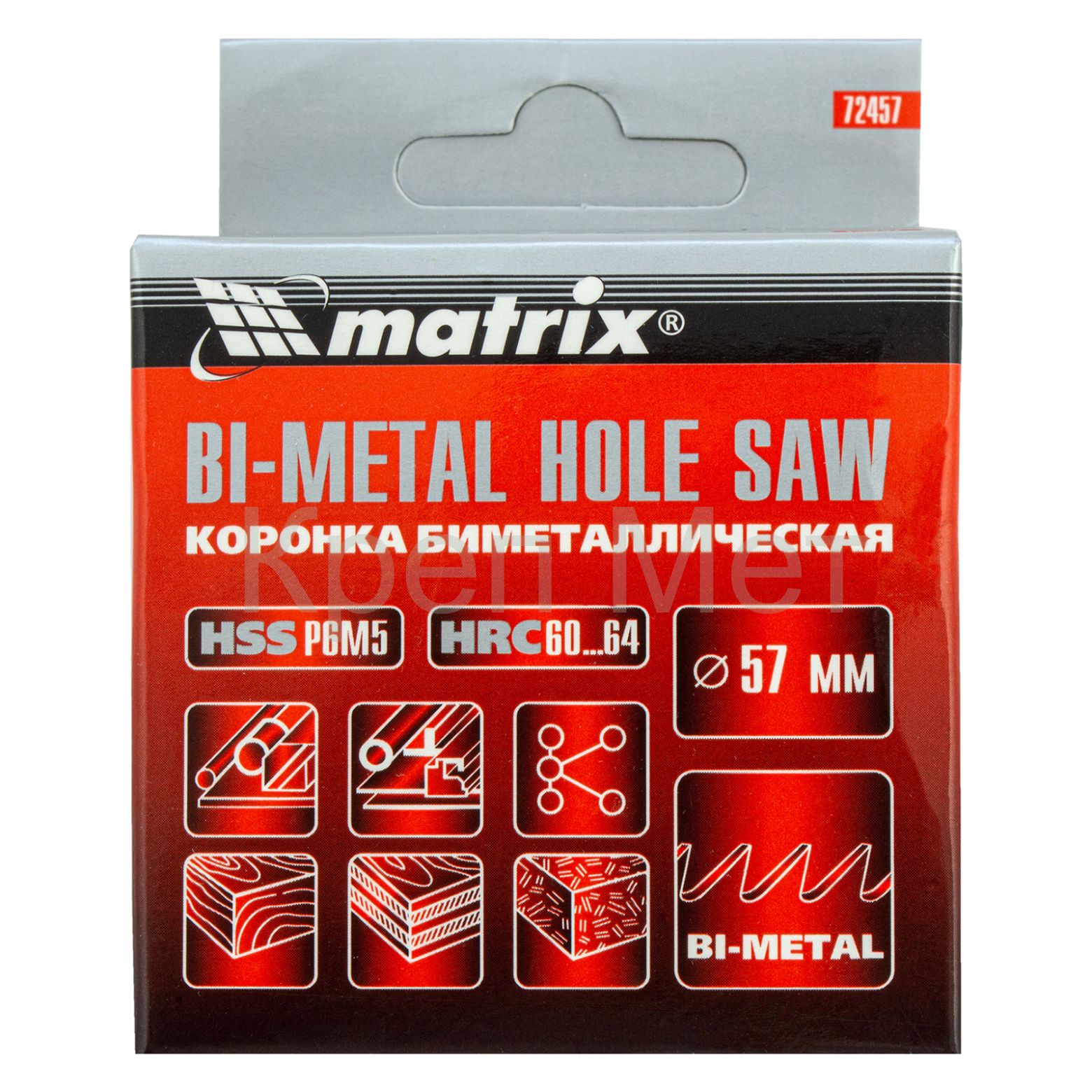 Коронка Matrix BIMETAL 72457 диаметром 57 мм — режущий инструмент, который устанавливается на дрель, перфоратор или стационарный станок. Используется для быстрого сверления черных и цветных металлов, пластика и других материалов. Позволяет получить отверстия большого диаметра при проведении электромонтажных работ и прокладке коммуникаций.
