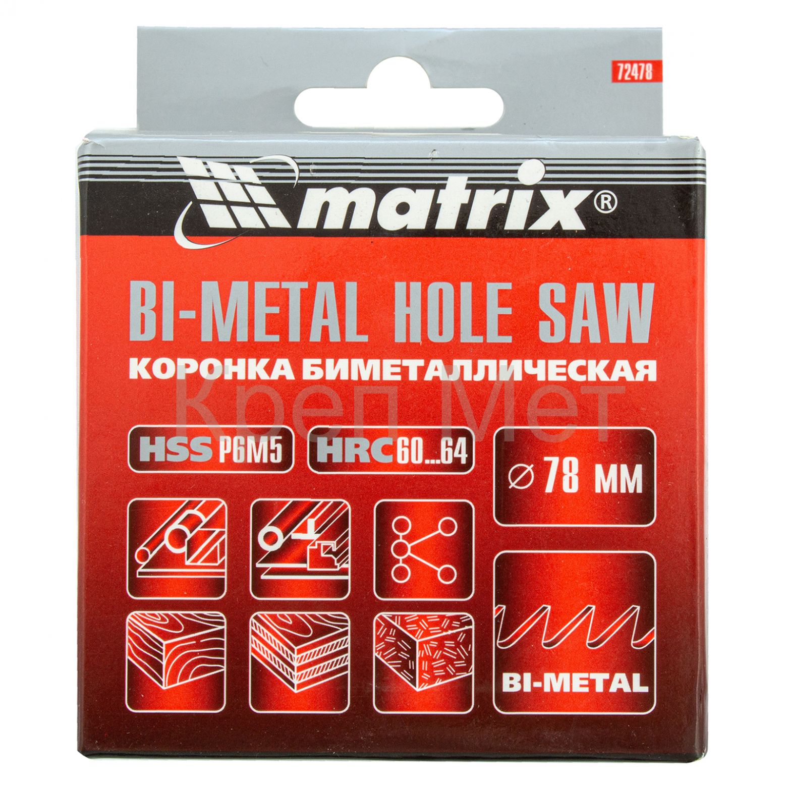 Коронка Matrix BIMETAL 72478 диаметром 78 мм — режущий инструмент, который устанавливается на дрель, перфоратор или стационарный станок. Используется для быстрого сверления черных и цветных металлов, пластика и других материалов. Позволяет получить отверстия большого диаметра при проведении электромонтажных работ и прокладке коммуникаций.