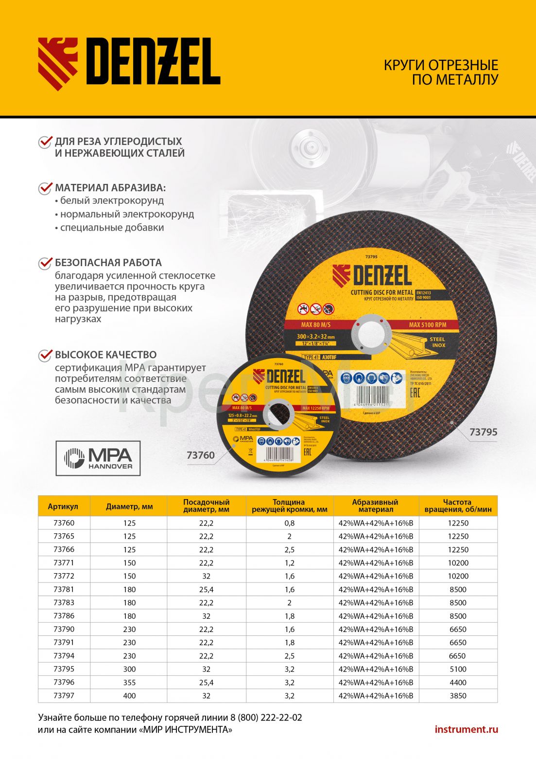 Отрезной круг по металлу Denzel A30TBF 73797 диаметром 400 мм и толщиной 3,2 мм устанавливается на углошлифовальную машину или станок с посадочным размером 32 мм. Предназначен для сухого резания углеродистых и нержавеющих сталей. Максимальная частота вращения составляет 3850 об/мин. Круг пригодится в слесарной мастерской.