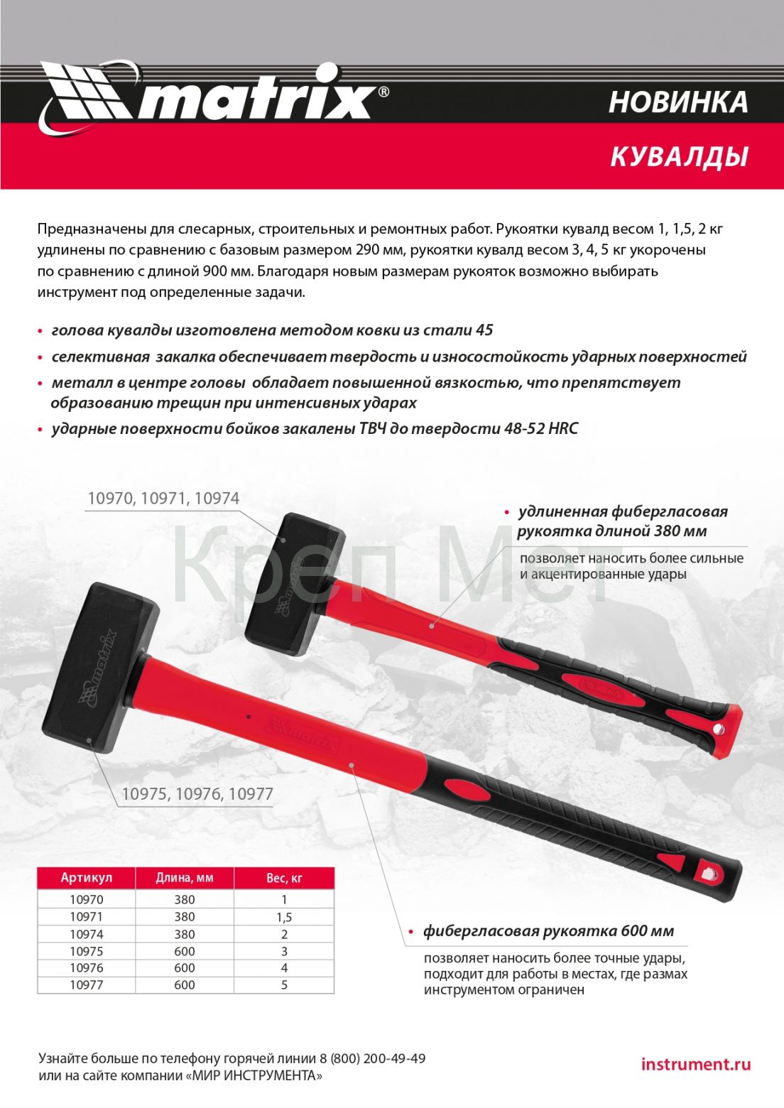 Кувалда Matrix 10974 с головой весом 2 кг и фибергласовой обрезиненной рукояткой 380 мм предназначена для нанесения несильных, но точных ударов. Позволяет забивать большие гвозди, колья, может использоваться для сгибания и придания формы металлическим деталям. Инструмент будет полезен на строительной площадке, на предприятии автосервиса, подойдет также и для бытового применения.