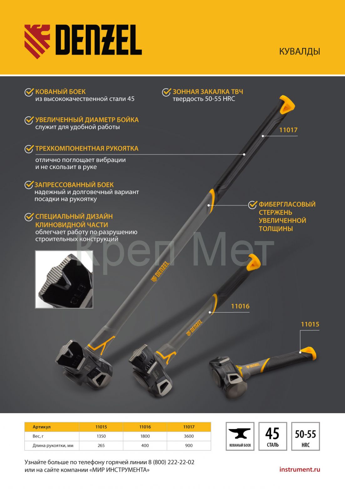 Кувалда Denzel 11016 с клиновидным бойком весом 1,8 кг и фибергласовой рукояткой с TPR-покрытием предназначена для нанесения ударов. Две рабочие зоны делают ее универсальной в работе: клиновидный боек позволяет разрушать кирпичную кладку, конструкции из бетона и камня, а плоский боек — забивать большие гвозди, колья, клинья и выполнять другие ударные работы. Инструмент также подходит для сгибания и придания формы металлическим деталям. Используется при проведении слесарных, строительных и кузовных работ, подойдет и для бытового применения.