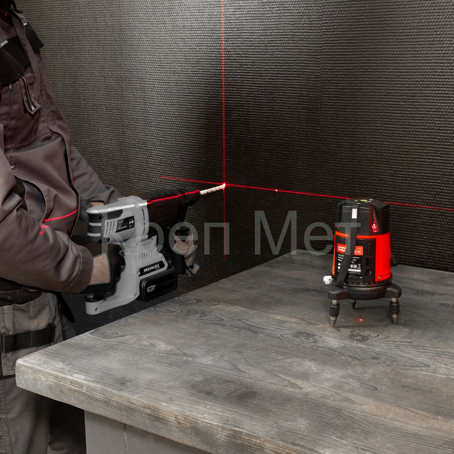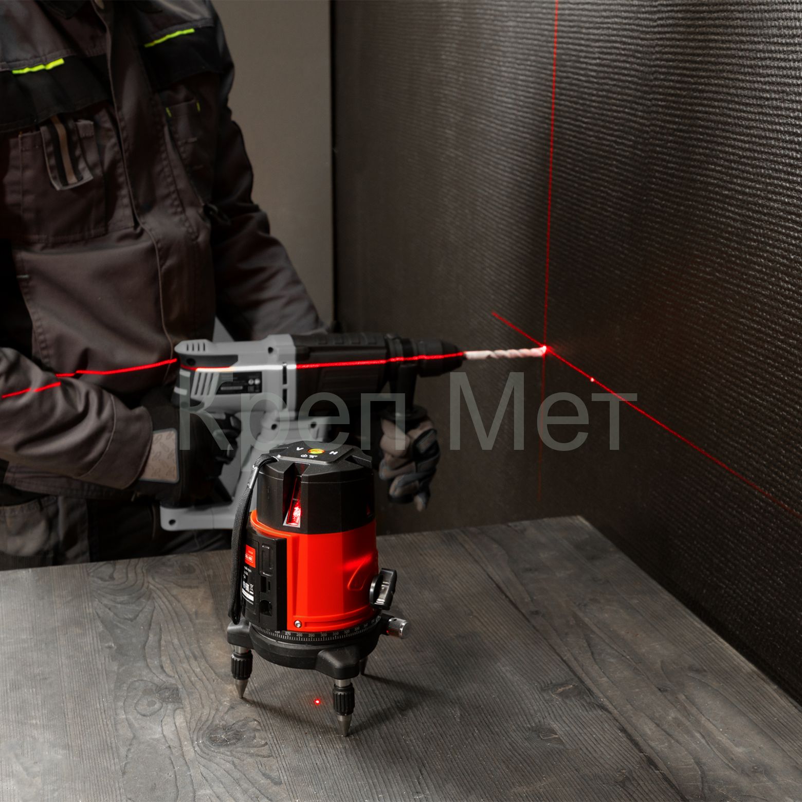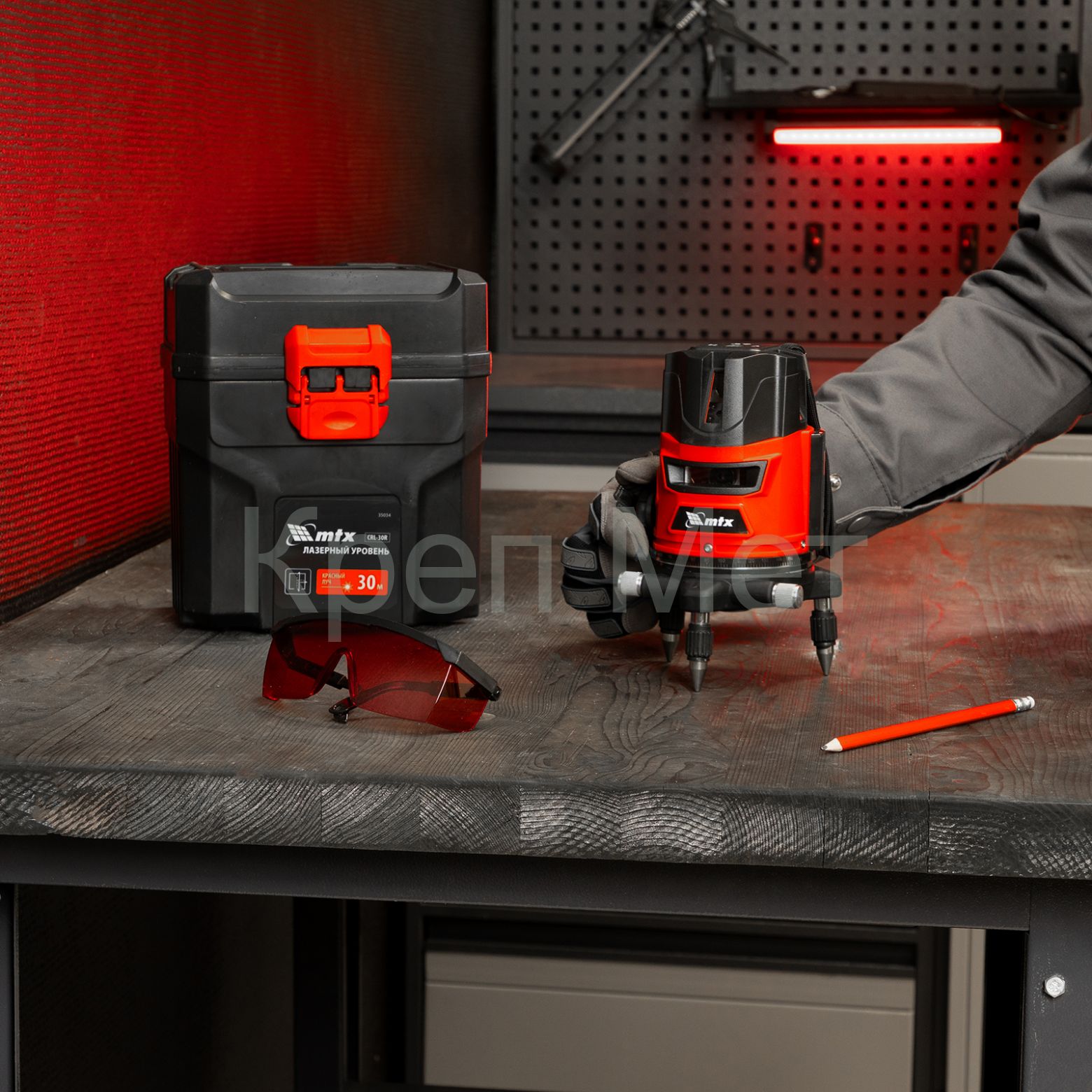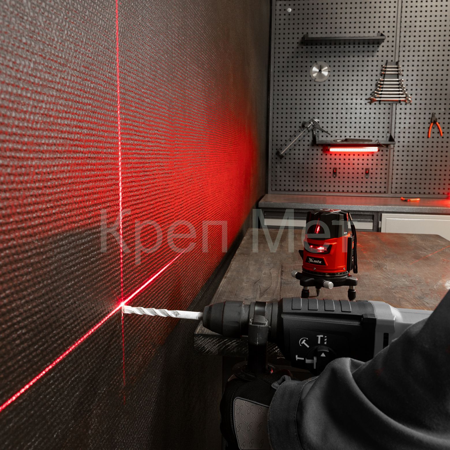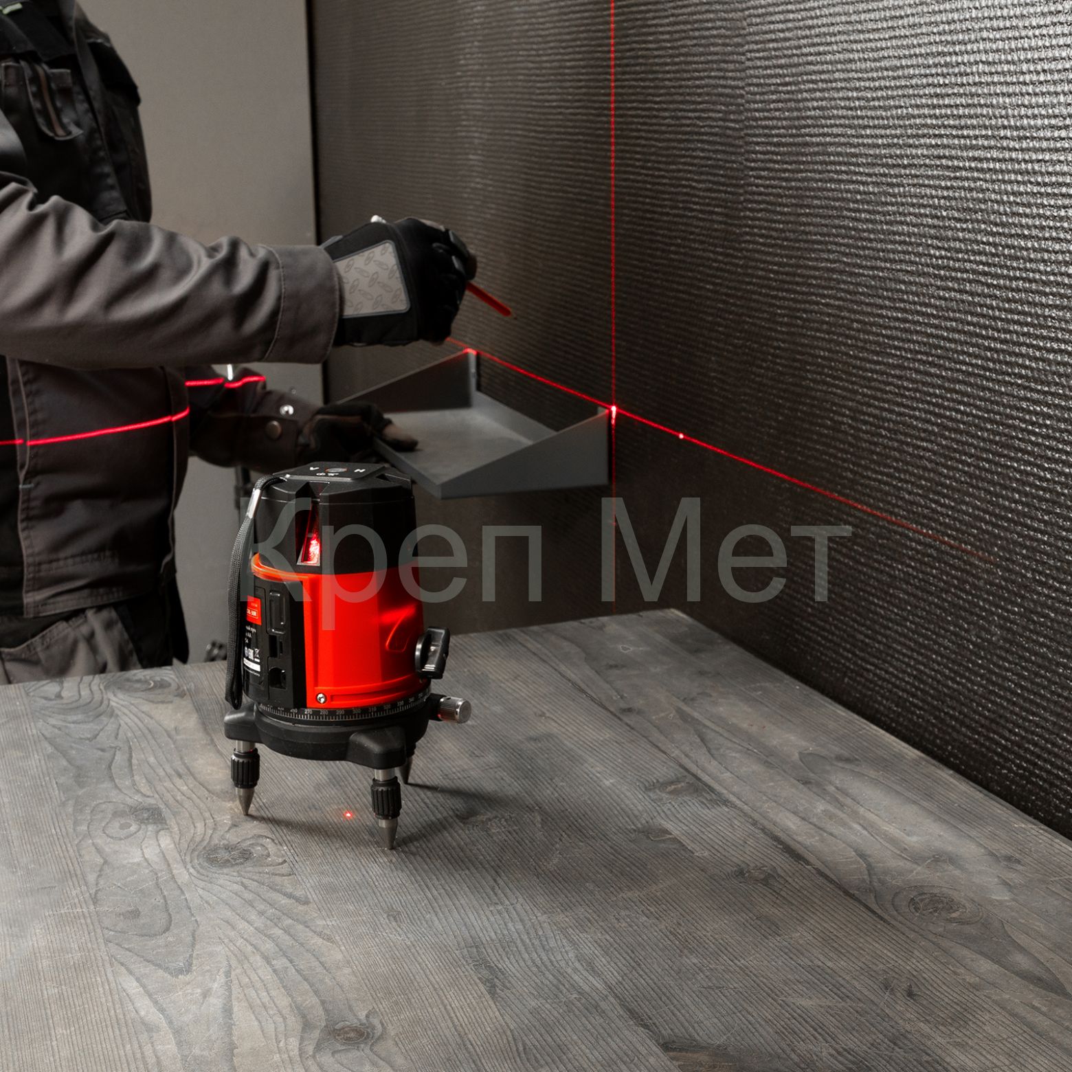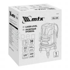 Лазерный уровень MTX CRL-30R 35034 с резьбой 5/8″ под штатив, в комплекте с батарейками, проецирует на поверхность 1 горизонтальный, 4 вертикальных луча красного цвета и точку отвеса дальностью до 30 м. Подходит для бытового применения в помещениях. Погрешность измерений составляет всего ±1,5 мм 5 м.
