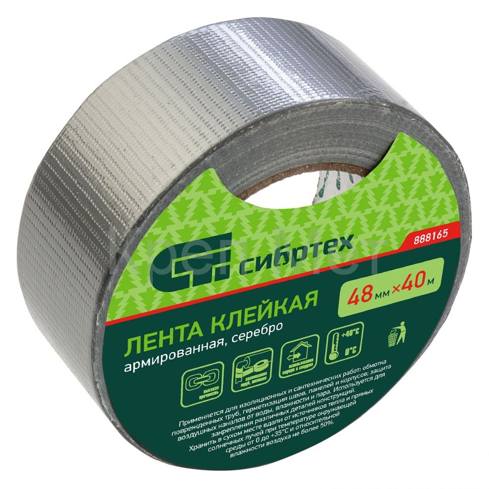 Клейкая армированная лента Сибртех 888165 размером 48 мм х 40 м, цвета серебра, используется для проведения изоляционных, сантехнических и монтажных работ. Применяется для обмотки поврежденных труб, герметизации швов, панелей и корпусов. Обеспечивает надежную изоляцию от влажности и пара. Позволяет также закреплять детали различных конструкций.