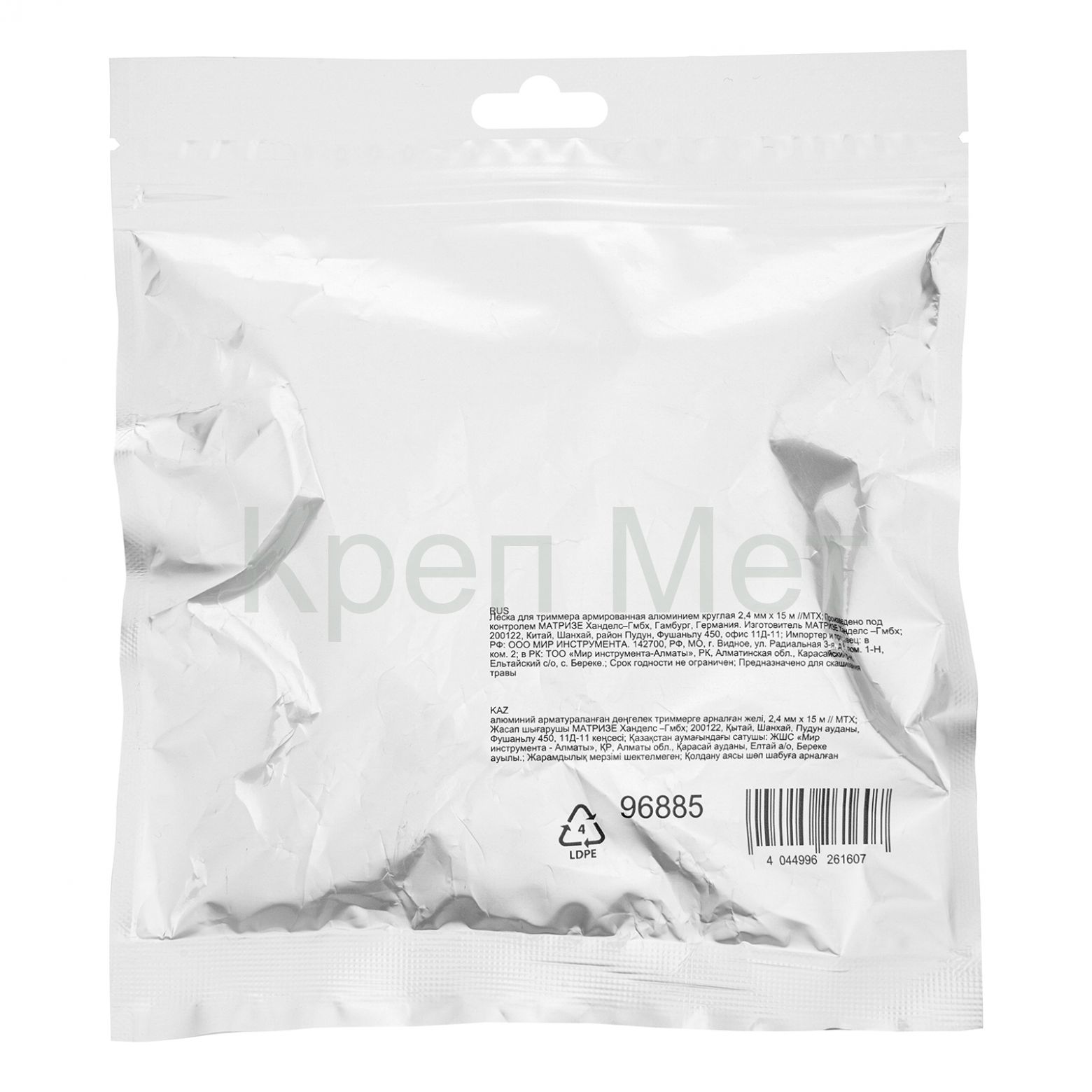 Леска для триммера MTX 96885 круглого сечения, диаметром 2,4 мм и длиной 15 м, армированная алюминием, эффективно срезает как молодую, газонную, так и высокую, жесткую траву. Совместно с бензиновым триммером позволяет привести в порядок загородный участок, придомовую территорию и т.д.