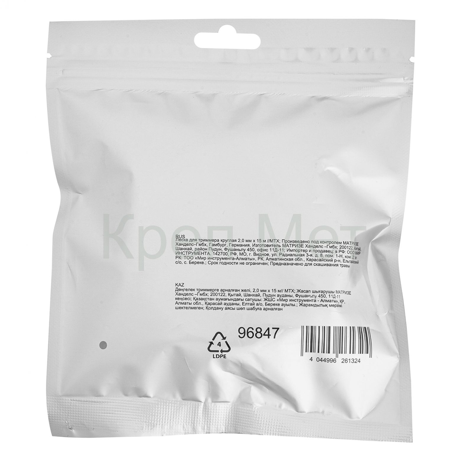 Леска для триммера MTX 96847 круглого сечения, диаметром 2,0 мм и длиной 15 м, предназначена для скашивания травы любой жесткости. Совместима с электрическими триммерами мощностью 1000-1500 Вт. Пригодится владельцам дачных участков.