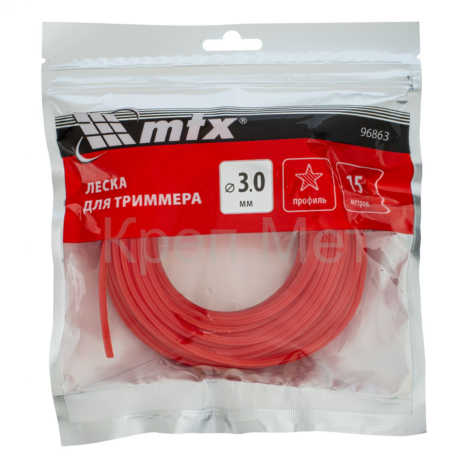 Леска для триммера MTX 96863 с сечением «звезда», толщиной 3,0 мм и длиной 15 м, подходит для скашивания как мягкой газонной, так и жесткой, а также сухой травы. Может применяться для срезания побегов кустов. Используется в качестве расходного материала для бензиновых триммеров. Необходима для ухода за дачным участком, пригодится сотрудникам коммунальных служб.