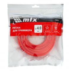 Леска для триммера MTX 96864 с сечением «звезда», толщиной 4,0 мм и длиной 15 м, подходит для скашивания как мягкой газонной, так и жесткой, а также сухой травы. Может применяться для срезания побегов кустов. Используется в качестве расходного материала для мощных бензиновых триммеров. Необходима для ухода за дачным участком, пригодится сотрудникам коммунальных служб.