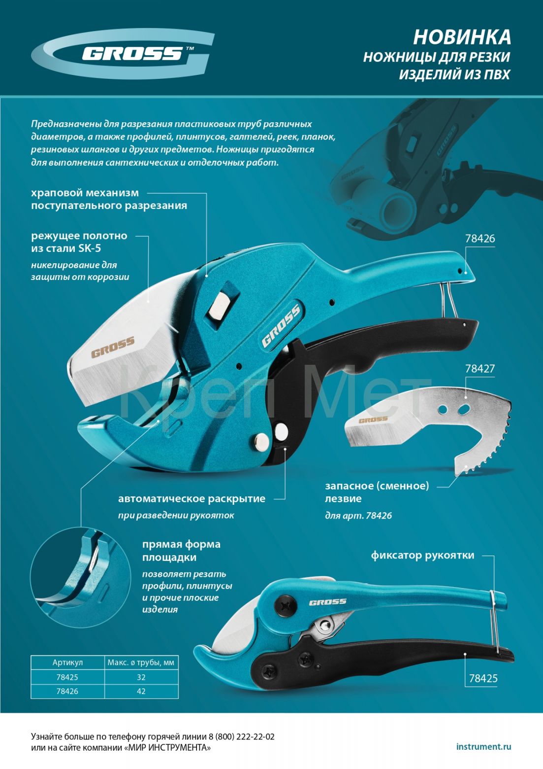 Лезвие Gross 78427 — сменный режущий элемент для ножниц по изделиям из ПВХ диаметром 42 мм, совместимый с арт. 78426. Предназначено для резки пластиковых труб, профилей, галтелей, плинтусов, реек, планок, резиновых шлангов и других предметов. Позволяет быстро восстановить работоспособность инструмента и избежать нежелательных перерывов в ходе сантехнических и отделочных работ.