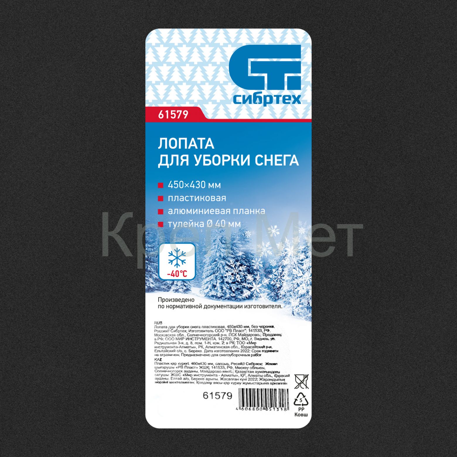 - Лопата для уборки снега пластиковая, 450 х 430 мм, без черенка, Сибртех